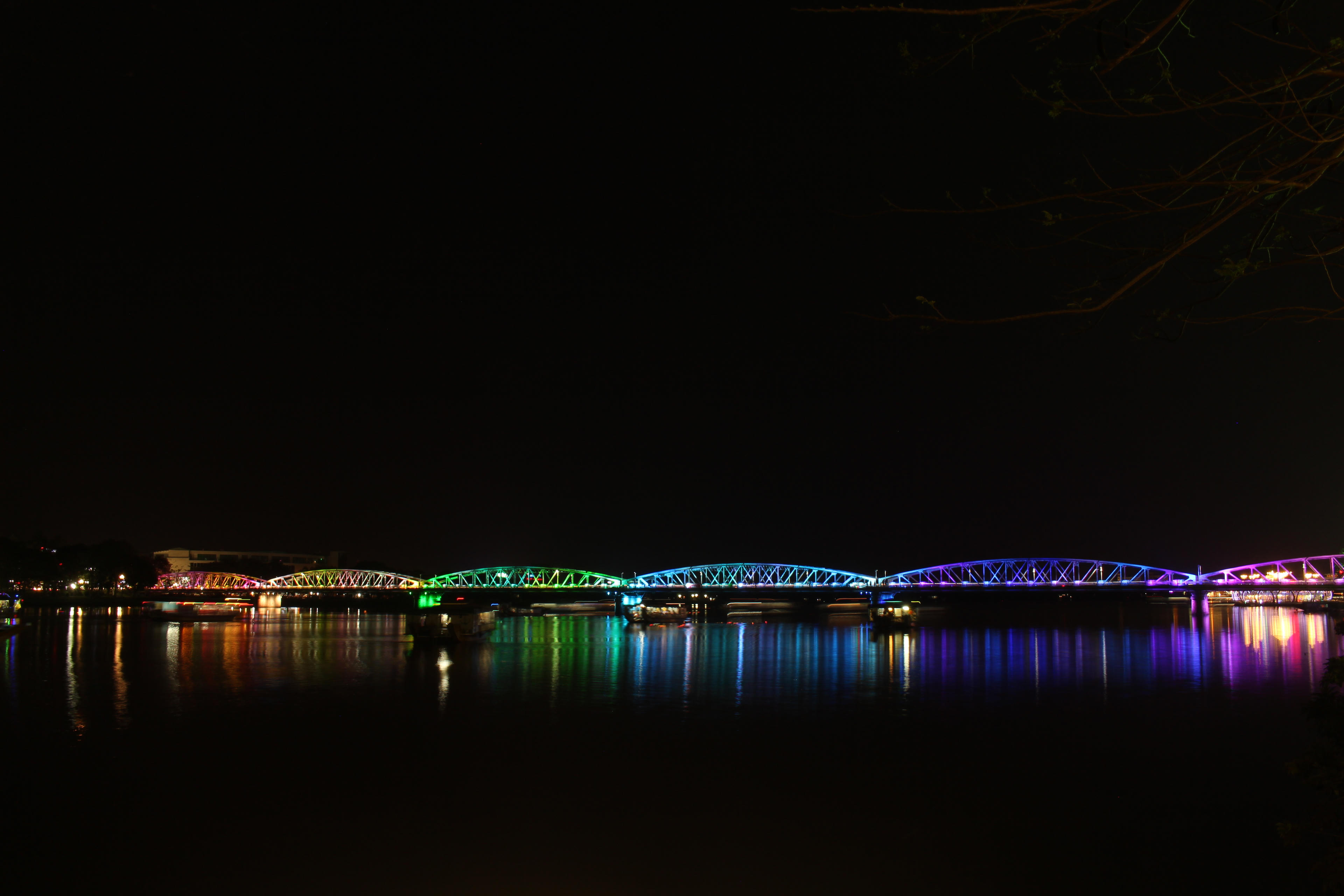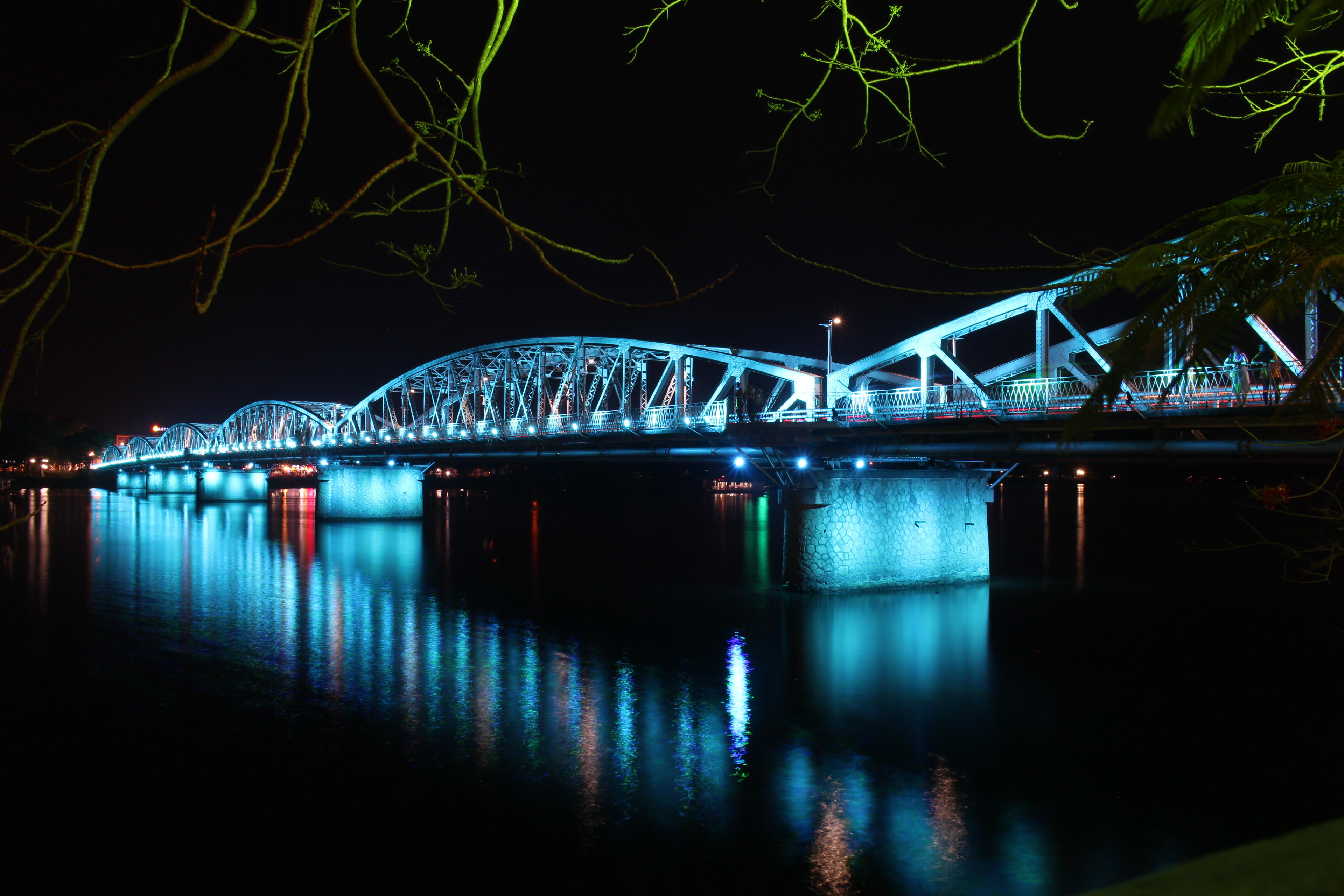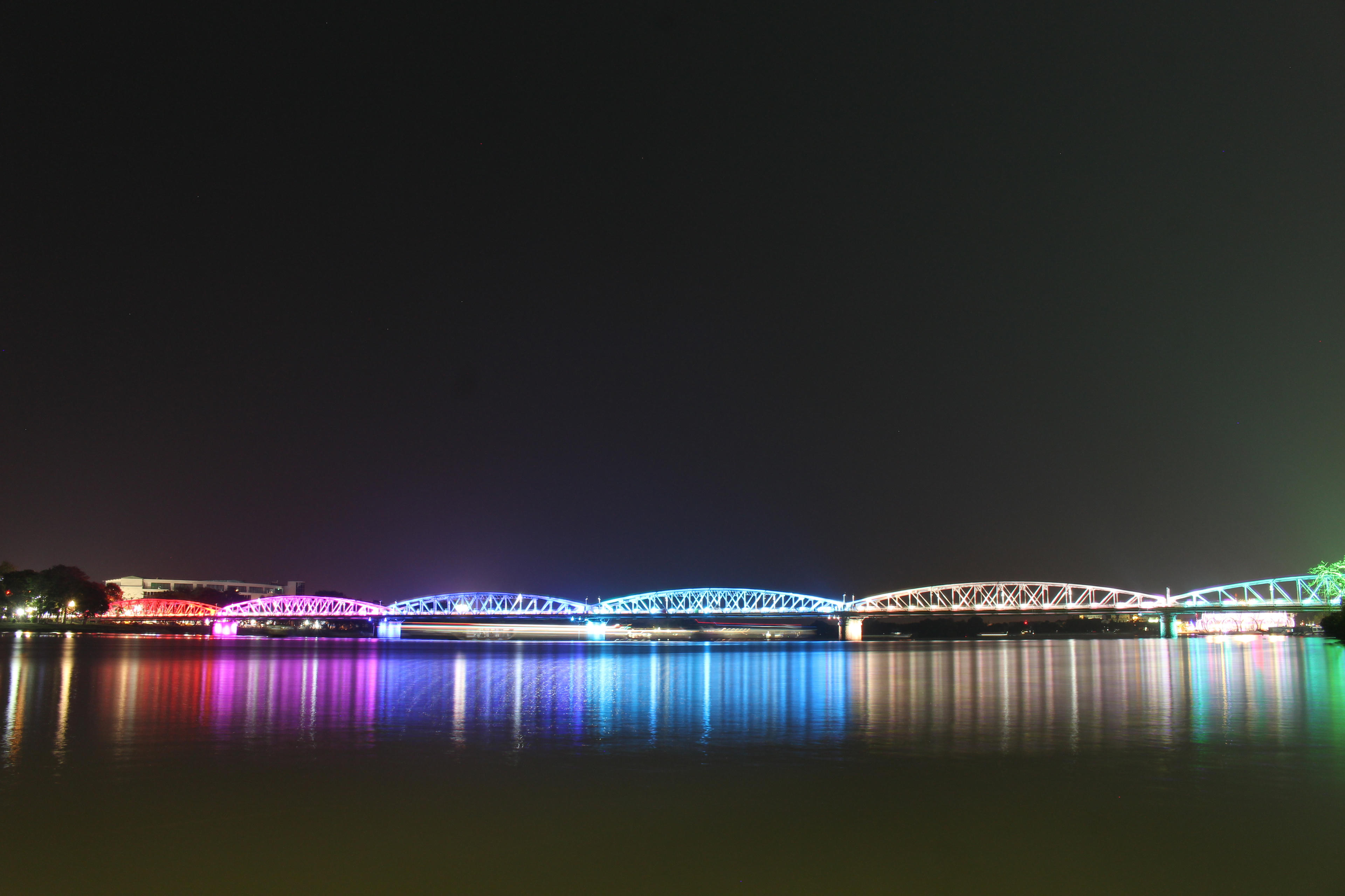 Cầu Trường Tiền bắc qua sông Hương, TP Huế tuổi đời 120 năm, nay được tô điểm bởi những màu sắc lung linh từ hệ thống đèn led hiện đại.