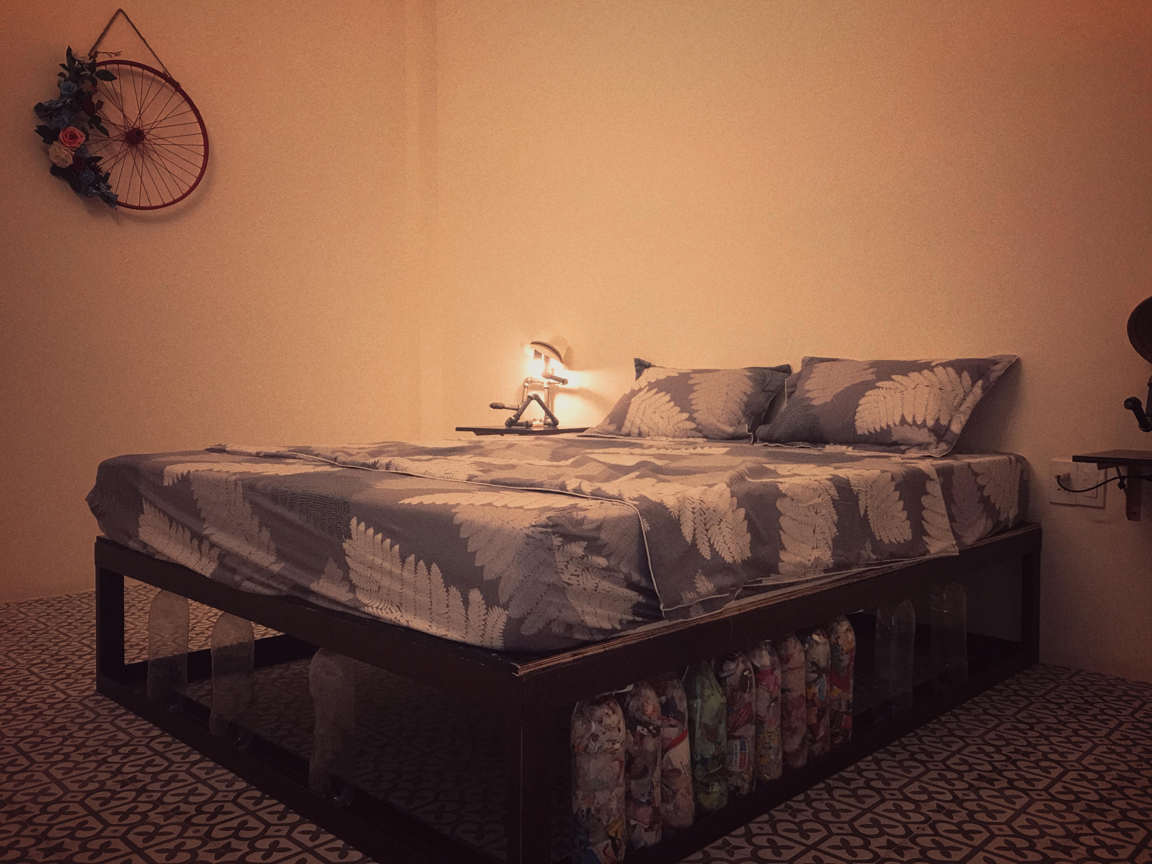Hay khi đặt chân đến với căn phòng “Trash - Ôm rác vào lòng” , nhiều người tỏ ra vô cùng lạ lẫm bởi tên gọi như vậy. Khi bước chân vào phòng, đập ngay vào mắt mọi người là những chai nhựa 1,5L được kê quanh dưới chân giường. Những chai nhựa được lấp đầy bởi bao bì ni lon, rác thải nhựa và đặt dọc quanh giường nhờ thiết kế riêng có khe rãnh để xếp đều các chai rác sinh thái.