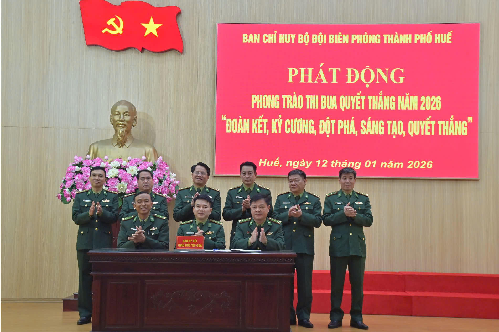 Cùng ngày, Ban Chỉ huy BĐBP TP Huế tổ chức hội nghị triển khai nhiệm vụ công tác Biên phòng năm 2026; phát động phong trào Thi đua Quyết thắng năm 2026 với chủ đề “Đoàn kết, kỷ cương, đột phá, sáng tạo, quyết thắng”.
