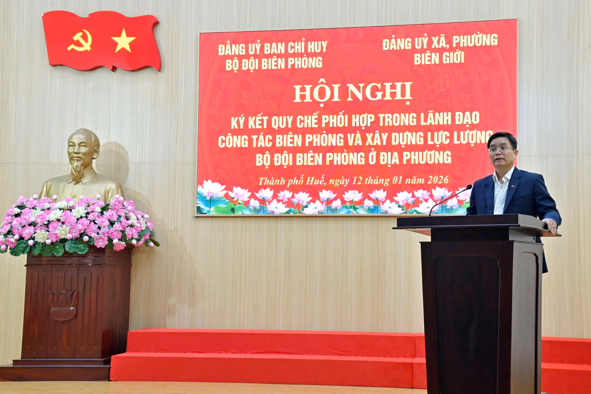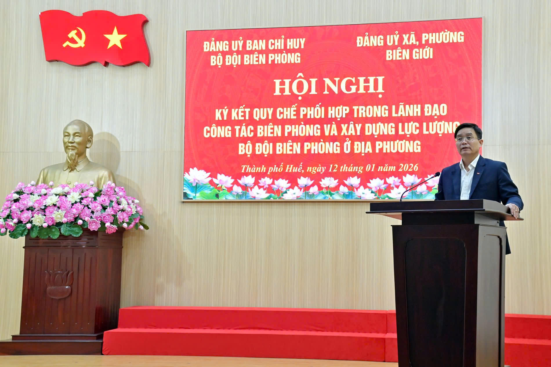 Chiều 12/1, Đảng ủy Ban Chỉ huy Bộ đội Biên phòng (BĐBP) TP Huế tổ chức ký kết quy chế phối hợp giữa Đảng ủy Ban Chỉ huy BĐBP với đảng ủy 12 xã, phường biên giới, giai đoạn 2025 - 2030. Dự và phát biểu chỉ đạo có Bí thư Thành ủy Huế Nguyễn Đình Trung.