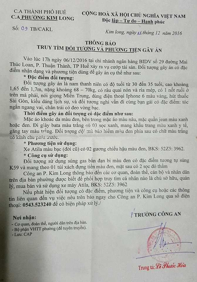 (PLO) - Đó là thông báo được phát đi của cơ quan chức năng về nhận dạng nghi phạm thực hiện vụ cướp hơn 700 triệu đồng tại Chi nhánh ngân hàng BIDV tại Huế vào chiều ngày 6/12