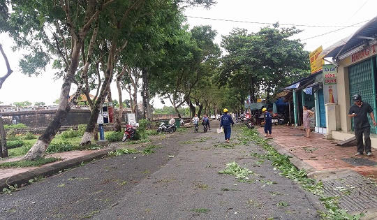 Trong sáng 13/9, nhân viên của Trung tâm công viên cây xanh Huế đã tiến hành dọn dẹp và cưa những cây bị đổ gãy, đảm bảo an toàn cho người đi đường.