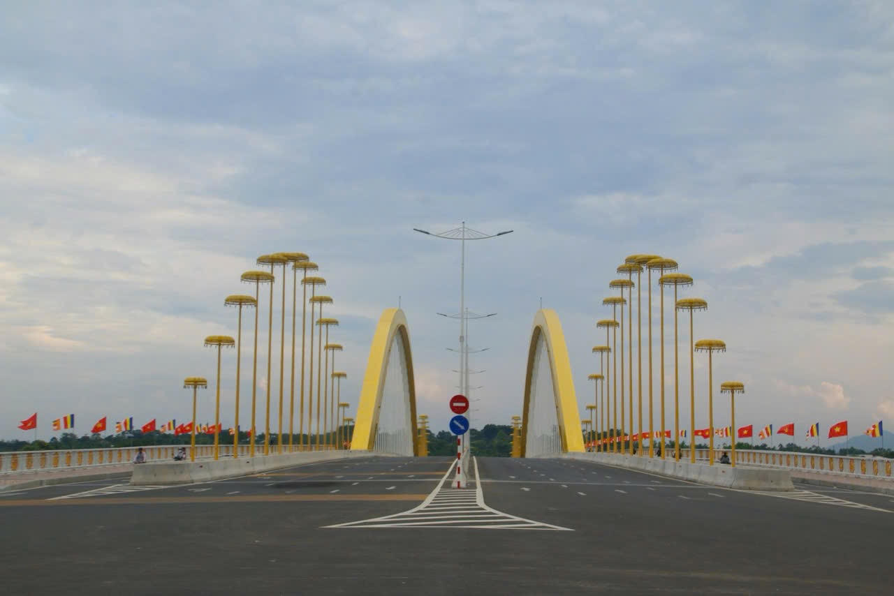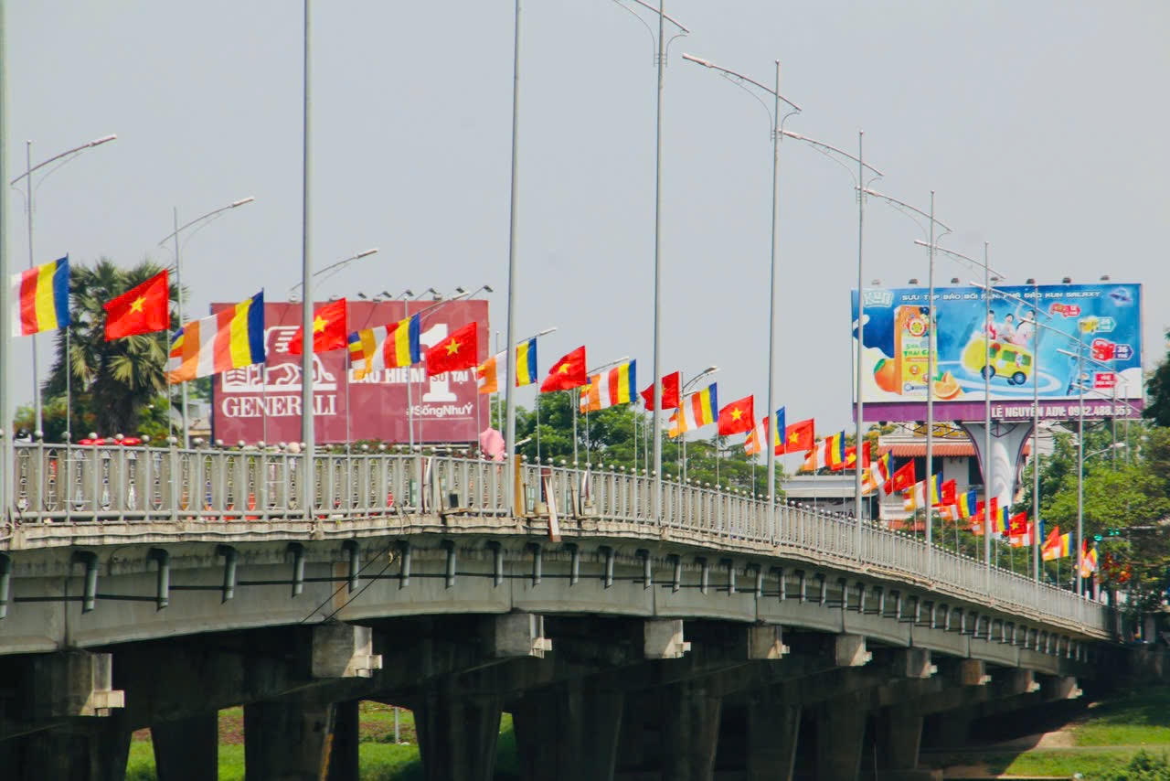 Nổi bật với hàng trăm lá cờ Tổ quốc và cờ Phật giáo, cầu Phú Xuân như khoác lên mình một màu áo mới. |