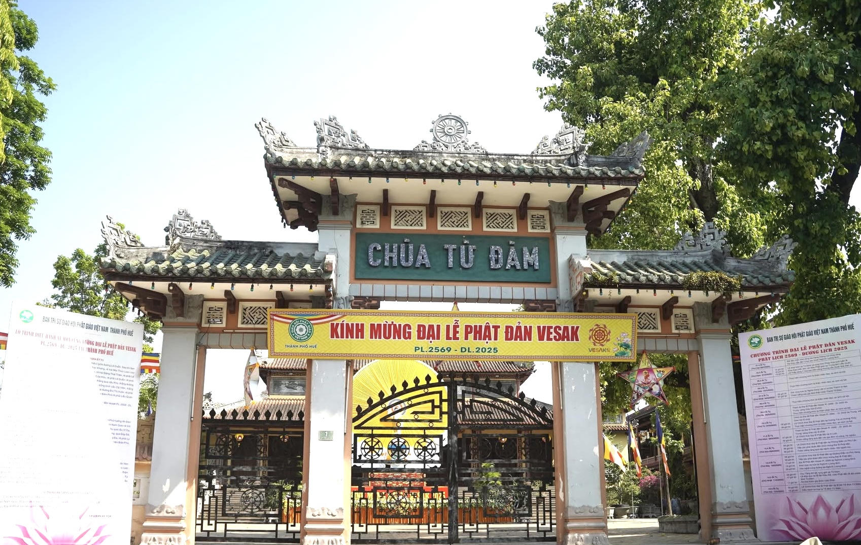 Khuôn viên chùa Diệu Đế được trang trí cờ hoa, lồng đèn... chào mừng Đại lễ Phật đản Vesak 2025. |