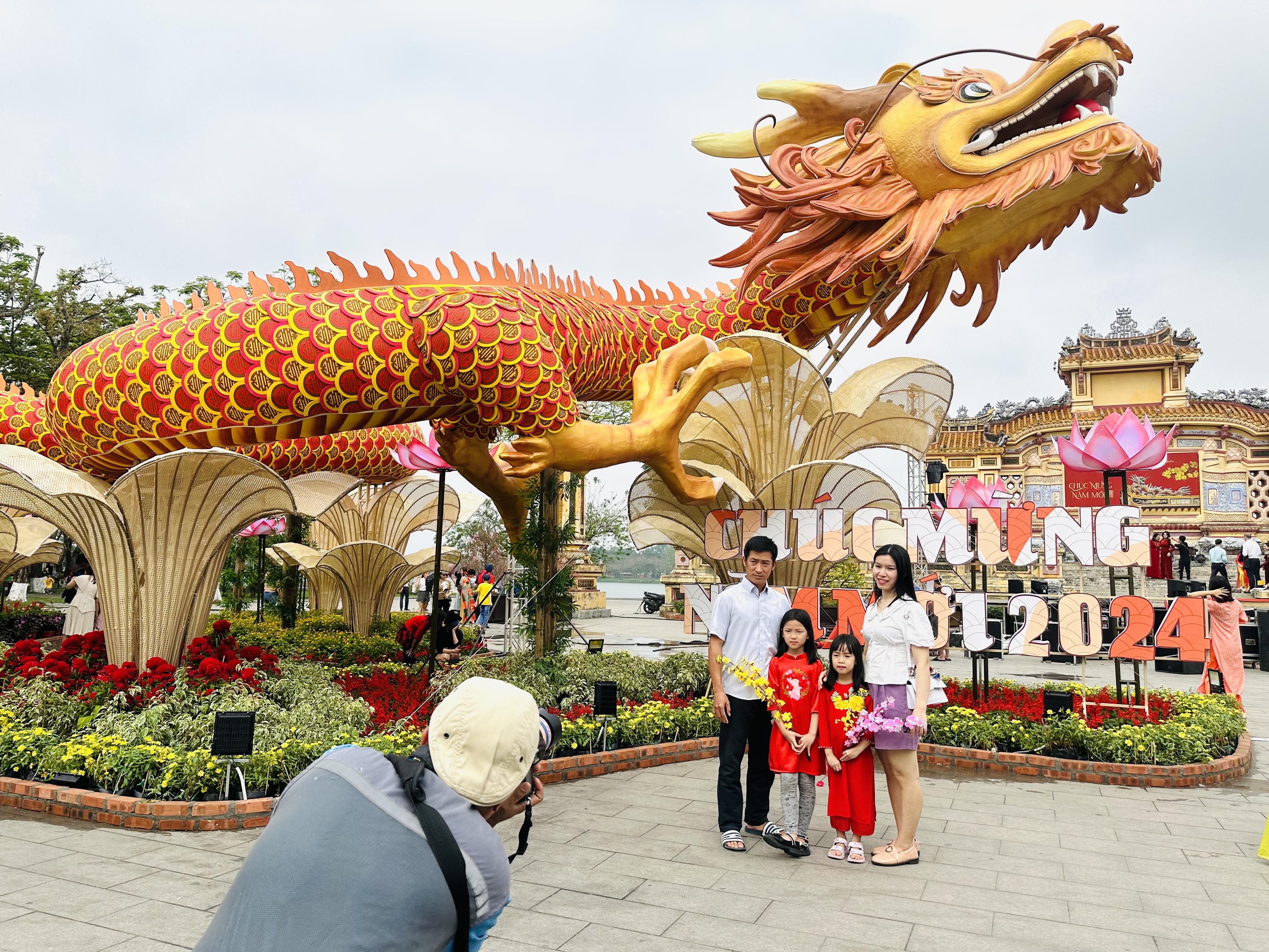 Người dân chụp ảnh cùng với linh vật rồng của TP Huế. |