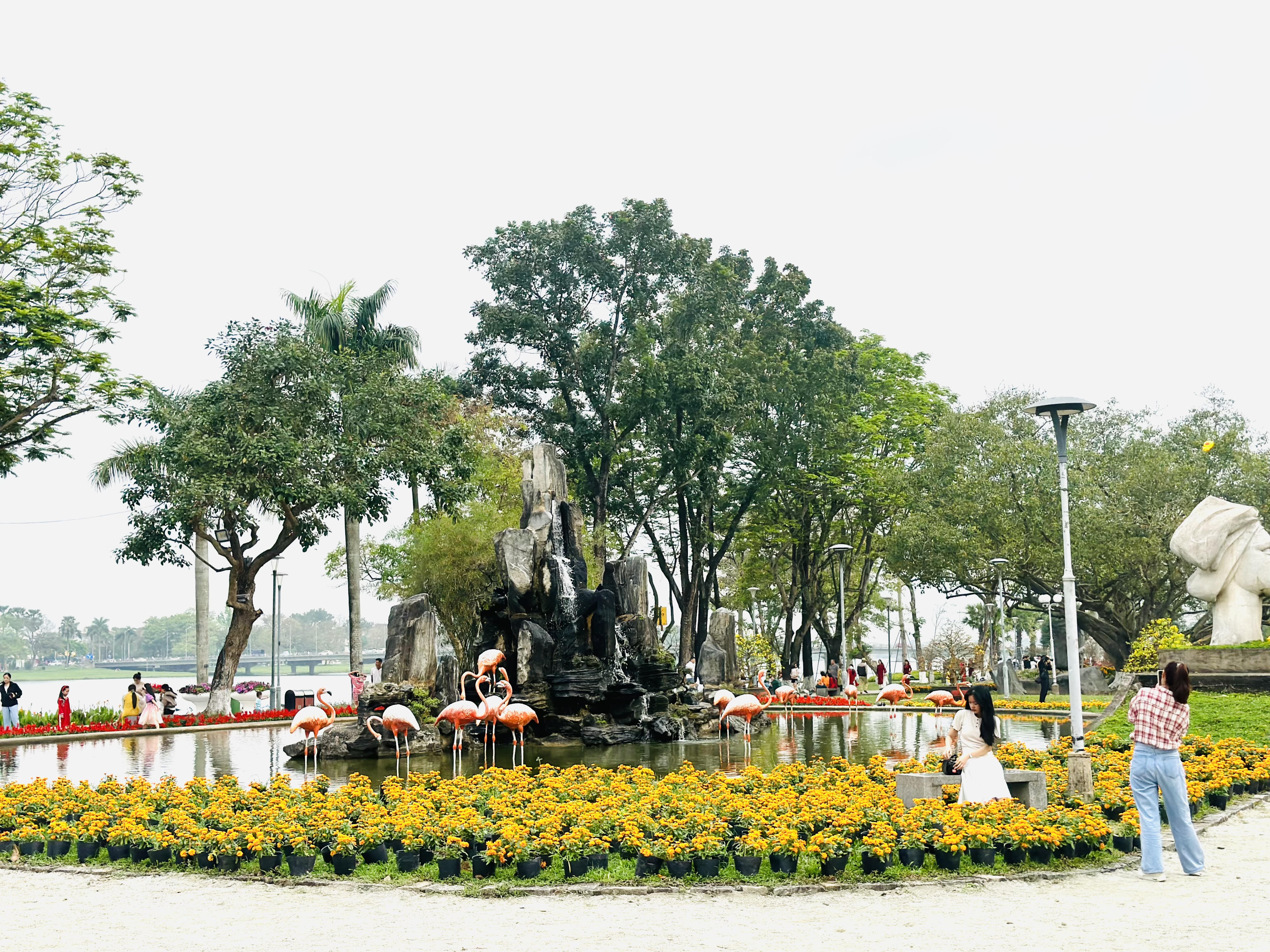 Đông du khách tham quan, chụp ảnh lưu niệm tại khu vực hoa viên và đài phun nước nghệ thuật ven sông Hương. |