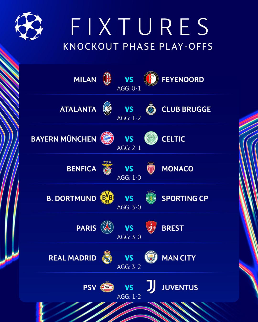 Các trận còn lại vòng play-off Champions League 2024/25 diễn ra vào ngày 19/2 là Milan gặp Feyenoord lúc 0 giờ 45; Benfica gặp Monaco lúc 3 giờ, Atalanta gặp Club Brugge cũng vào lúc 3 giờ.