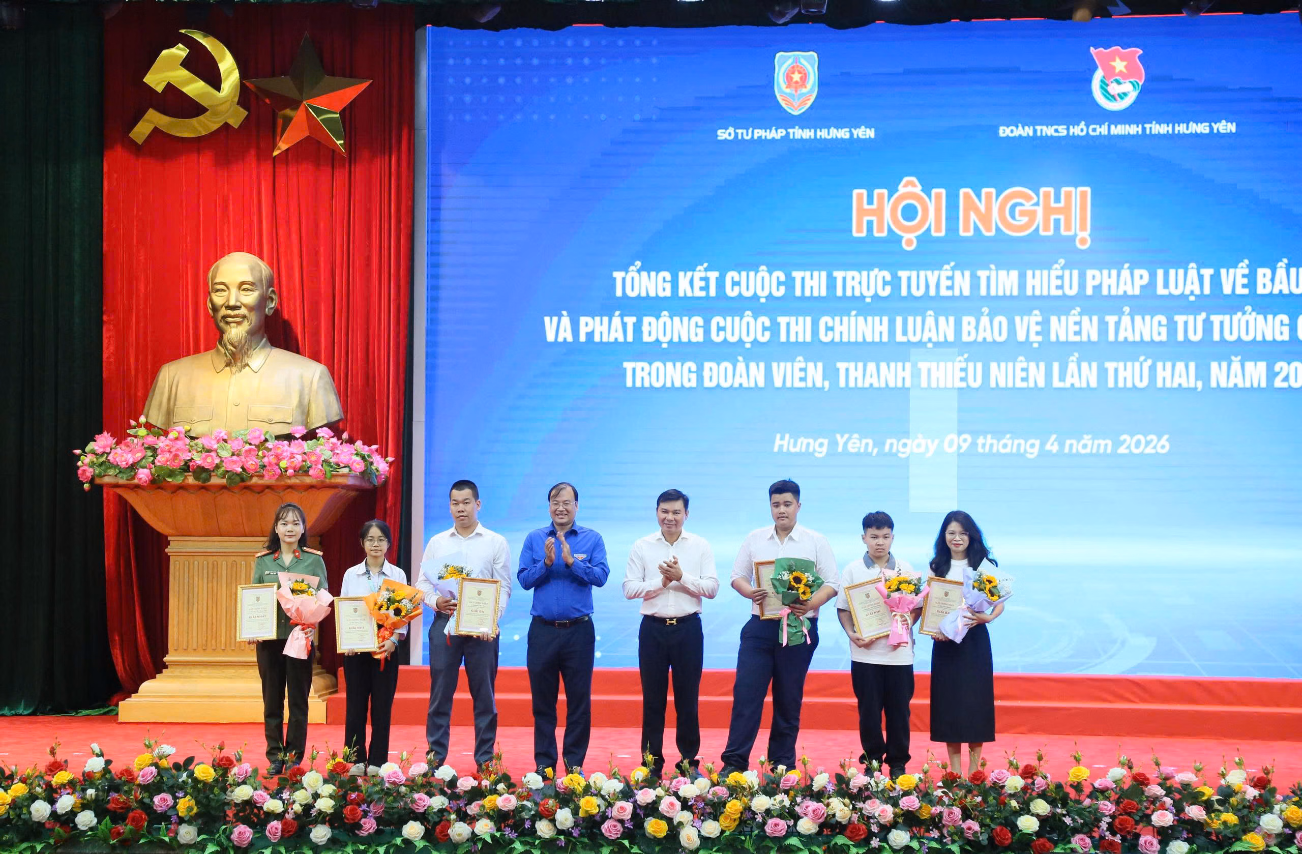 (PLVN) - Ngày 9/4, tại Hưng Yên, Sở Tư pháp phối hợp với Tỉnh đoàn tổ chức hội nghị tổng kết Cuộc thi trực tuyến “Tìm hiểu pháp luật về bầu cử đại biểu Quốc hội và đại biểu HĐND” và phát động Cuộc thi chính luận bảo vệ nền tảng tư tưởng của Đảng trong đoàn viên, thanh thiếu niên lần thứ hai năm 2026.