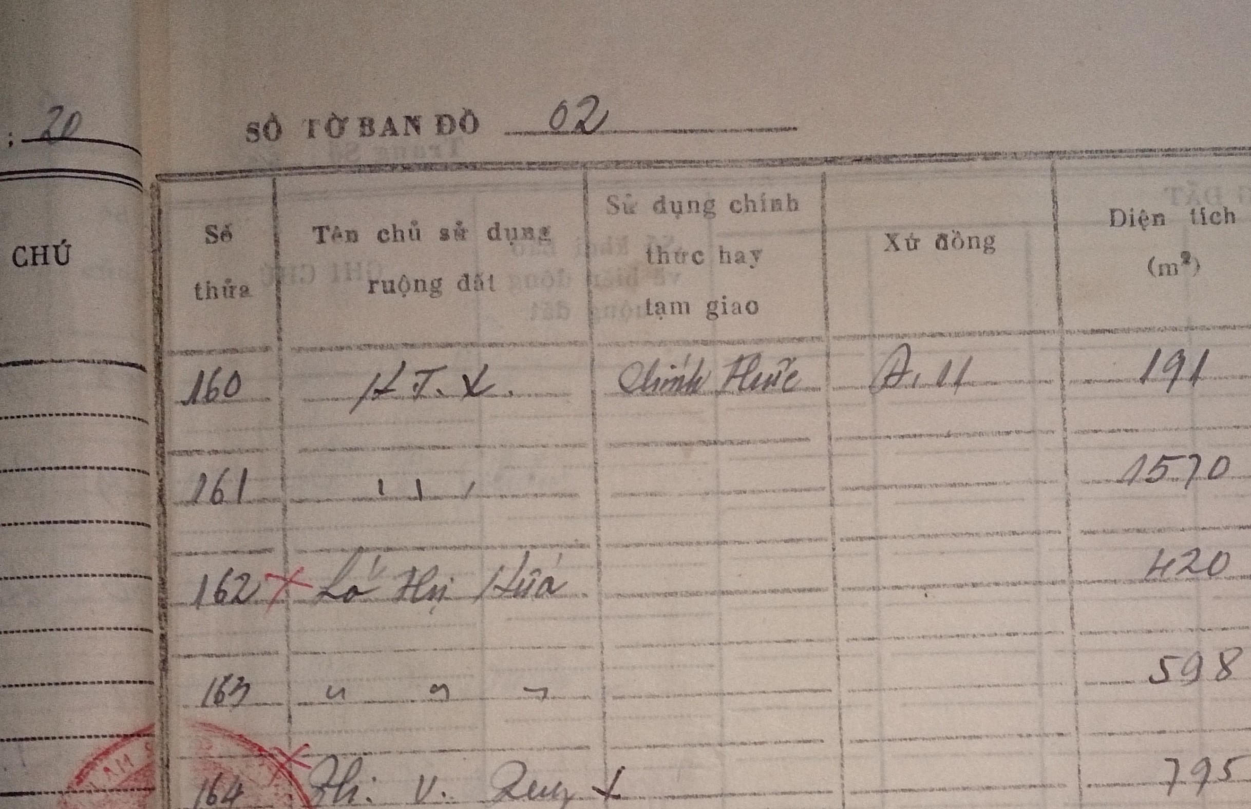 Cũng tại buổi làm việc này, ông Tùng cung cấp cho PV sổ mục kê ruộng đất (lập theo bản đồ 299) thì tại trang tờ bản đồ số 2, thửa 161, phần chủ sử dụng ruộng đất chỉ thấy có 2 dấu mực gạch dọc (//). Ô sử dụng chính thức hay tạm giao, ô xứ đồng đều để trống, ô diện tích ghi 1570m2, loại ruộng đất: ao.