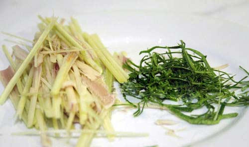 - Cho 4 gốc sả và 1/2 thìa cafe tiêu xay vào cối. Giã tơi ra.