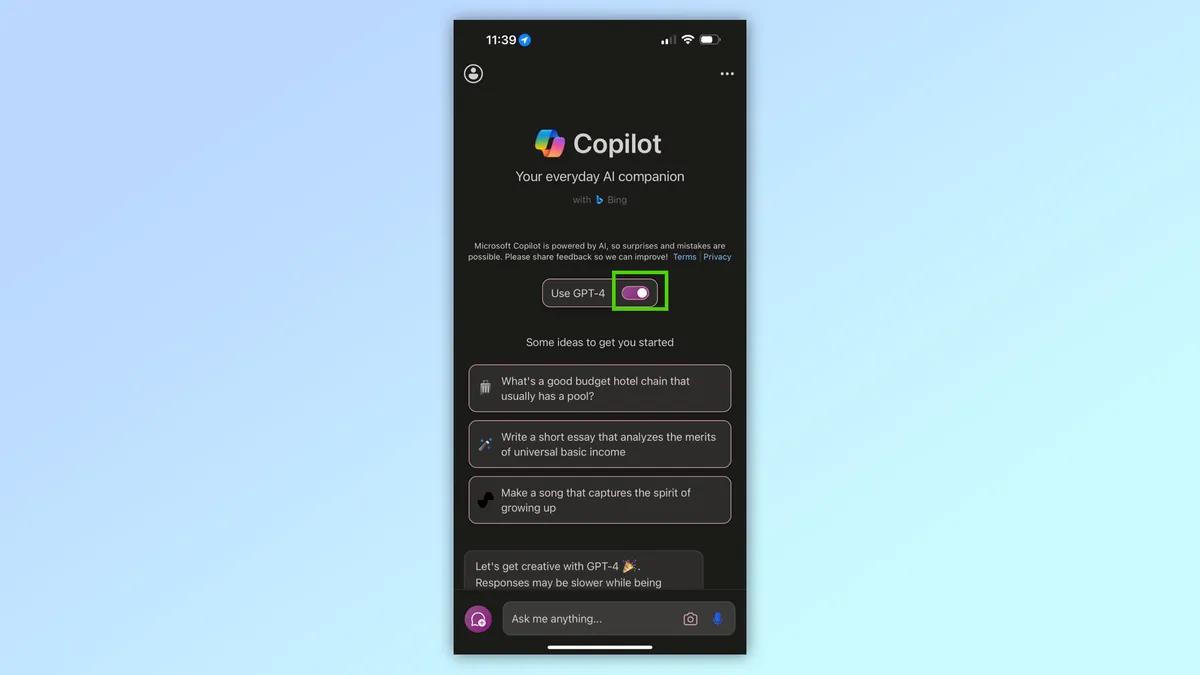 Bật nút "Use GPT-4" trên copilot để sử dụng ChatGPT Plus miễn phí |