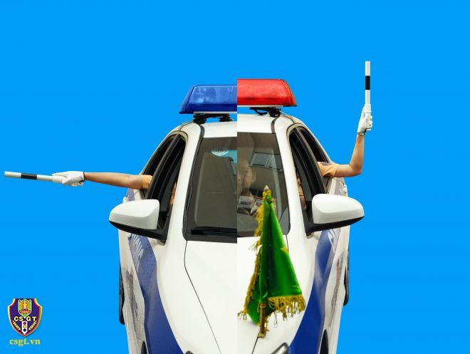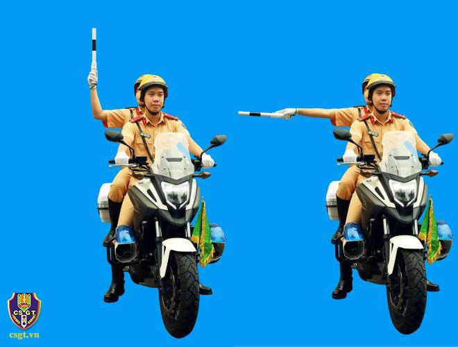 Cùng lúc cánh tay phải và cánh tay trái của Cảnh sát giao thông thực hiện đồng thời động tác yêu cầu người tham gia giao thông dừng lại kết hợp thổi 01 (một) tiếng còi dài, mạnh.