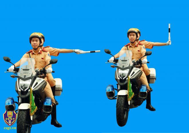Tay phải của Cảnh sát giao thông đưa ra ngang vai, bàn tay, cánh tay dưới, cánh tay trên thành một đường thẳng, lòng bàn tay úp xuống, song song với mặt đất. Đồng thời, đưa gậy điều khiển giao thông lên vuông góc với cánh tay trên, cánh tay dưới, lòng bày tay hướng ra ngoài vuông góc với mặt đất, kết hợp thổi 01 (một) tiếng còi dài, mạnh.