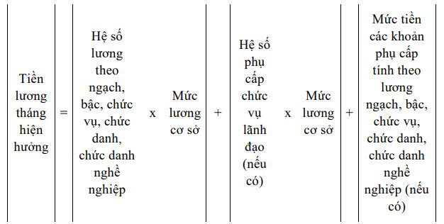 Tiền lương tháng hiện hưởng bao gồm: Mức tiền lương theo ngạch, bậc, chức vụ, chức danh, chức danh nghề nghiệp và các khoản tiền phụ cấp lương (gồm phụ cấp chức vụ lãnh đạo; phụ cấp thâm niên vượt khung; phụ cấp thâm niên nghề; phụ cấp ưu đãi theo nghề; phụ cấp trách nhiệm theo nghề; phụ cấp công vụ; phụ cấp công tác đảng, đoàn thể chính trị - xã hội, nếu có). Đối với người hưởng mức lương bằng tiền theo thỏa thuận ghi trong hợp đồng lao động thì tiền lương tháng hiện hưởng là mức tiền lương tháng được ghi trong hợp đồng lao động.