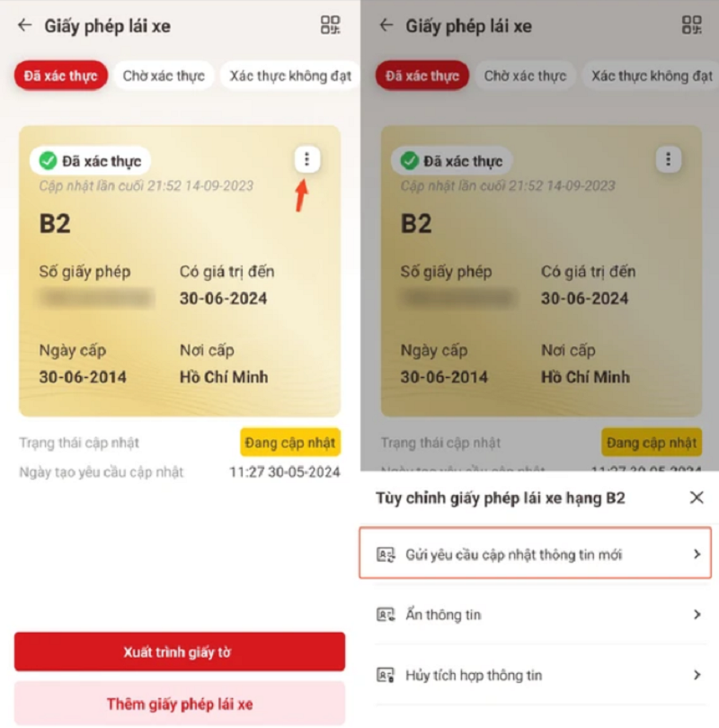 Bước 4: Trong cửa sổ mới hiện ra, nếu thấy thời hạn sử dụng của giấy phép lái xe chưa được cập nhật, người dùng chỉ cần bấm vào biểu tượng ba chấm ở góc phải, sau đó chọn Gửi yêu cầu cập nhật thông tin mới. Thông tin giấy phép lái xe sẽ được cập nhật sau khi xác thực hoàn tất.