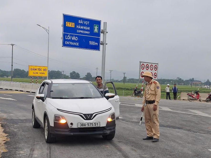 (PLVN) - Sau khi hai tuyến cao tốc Bãi Vọt - Hàm Nghi và Hàm Nghi - Vũng Áng (Hà Tĩnh) chính thức đưa vào khai thác, vận hành, các lực lượng chức năng phối hợp phân luồng, hướng dẫn vào, ra tại các nút giao kết nối cao tốc.