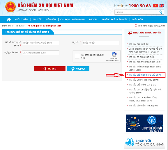 Bước 1: Truy cập https://baohiemxahoi.gov.vn/ >> Chọn Tra cứu trực tuyến >> Chọn Tra cứu giá trị sử dụng thẻ BHYT.