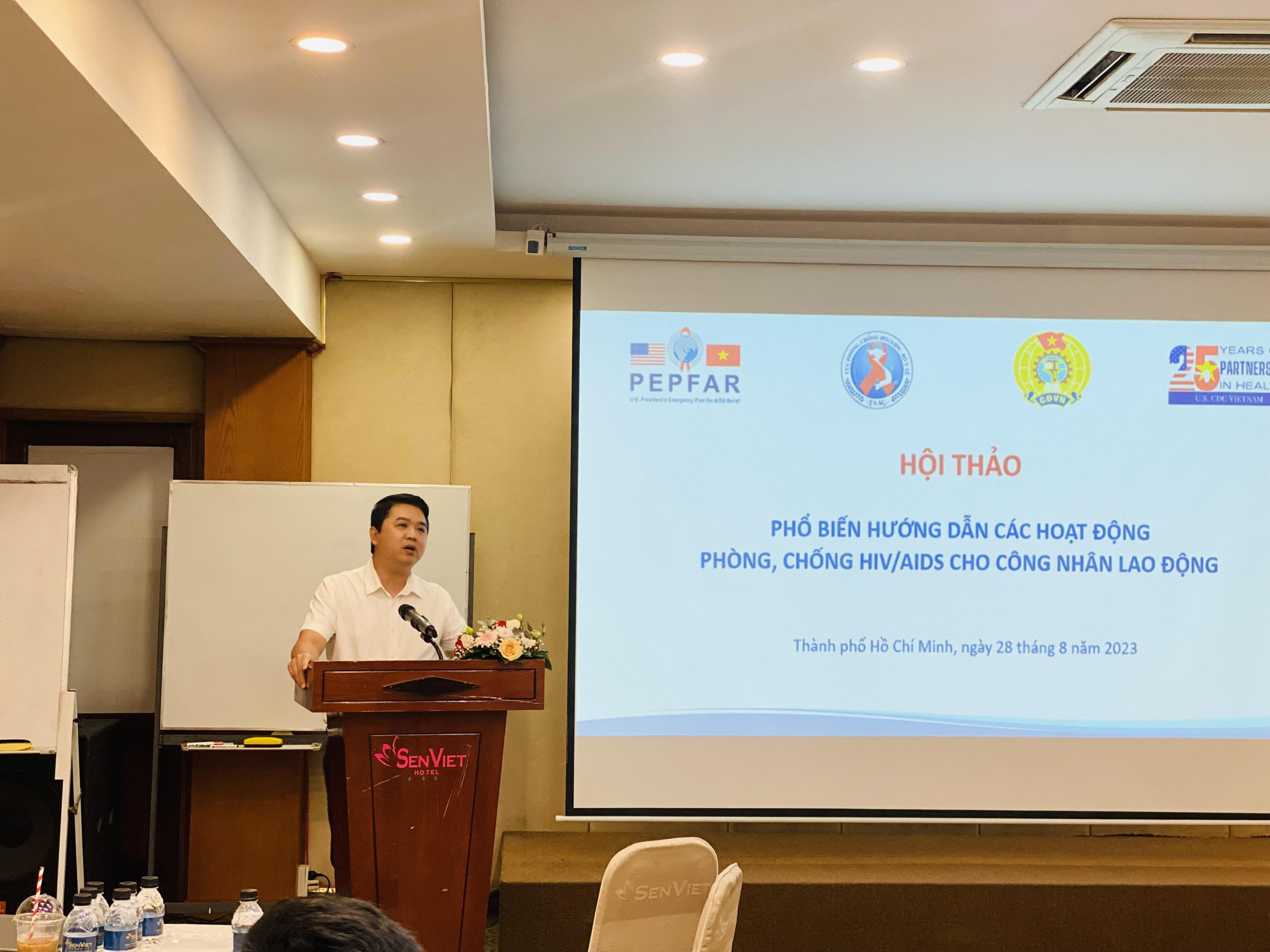 Buổi hội thảo có sự chủ trì và tham dự của ông ThS.BS Võ Hải Sơn - Phó Cục trưởng Cục Phòng, chống HIV/AIDS, ông Vũ Mạnh Tiêm - Phó trưởng Ban Tuyên giáo, Tổng liên đoàn Lao động Việt Nam, đại diện CDC Hoa Kỳ tại Việt Nam và đại diện lãnh đạo liên đoàn lao động tại 8 tỉnh, thành phố khu vực phía Nam.