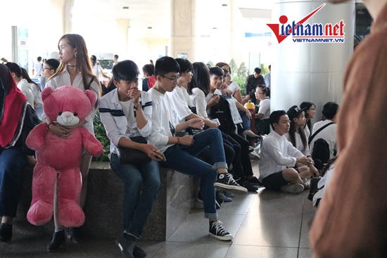 Người hâm mộ xếp hàng trật kín tại sảnh chờ của sân bay.
