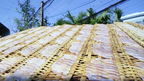 Công đoạn tắm nắng, phơi sương cho bánh tráng. |