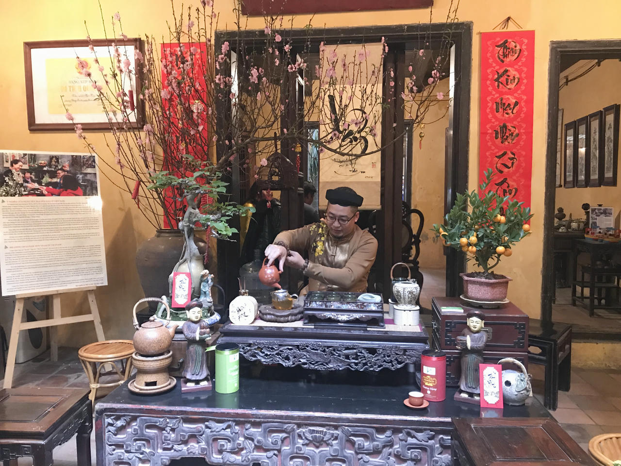 Đến với ngôi nhà di sản, 87 Mã Mây, mọi người có thể đchiêm ngưỡngcách pha trà và thưởng trà dịp tết. Nghệ nhân trà Nguyễn Cao Sơn cho biết: “Với người Việt, uống trà là một thú chơi thanh đạm, đặc biệt trong mỗi dịp Tết đến, xuân về. Pha một ấm trà, người pha dồn vào đó biết bao công phu, chúng tích tụ lại và dần trở thành những lễ nghi tao nhã. Người Hà Nội chuộng trà mạn sen, chè Ô Long, Liên Tâm, Thiết Quan Âm vỏ thiếc… Mỗi chén trà là một câu chuyện, là những tâm tình về một năm đã qua và những ước nguyện, tâm niệm cho một năm mới sung túc, đủ đầy”.