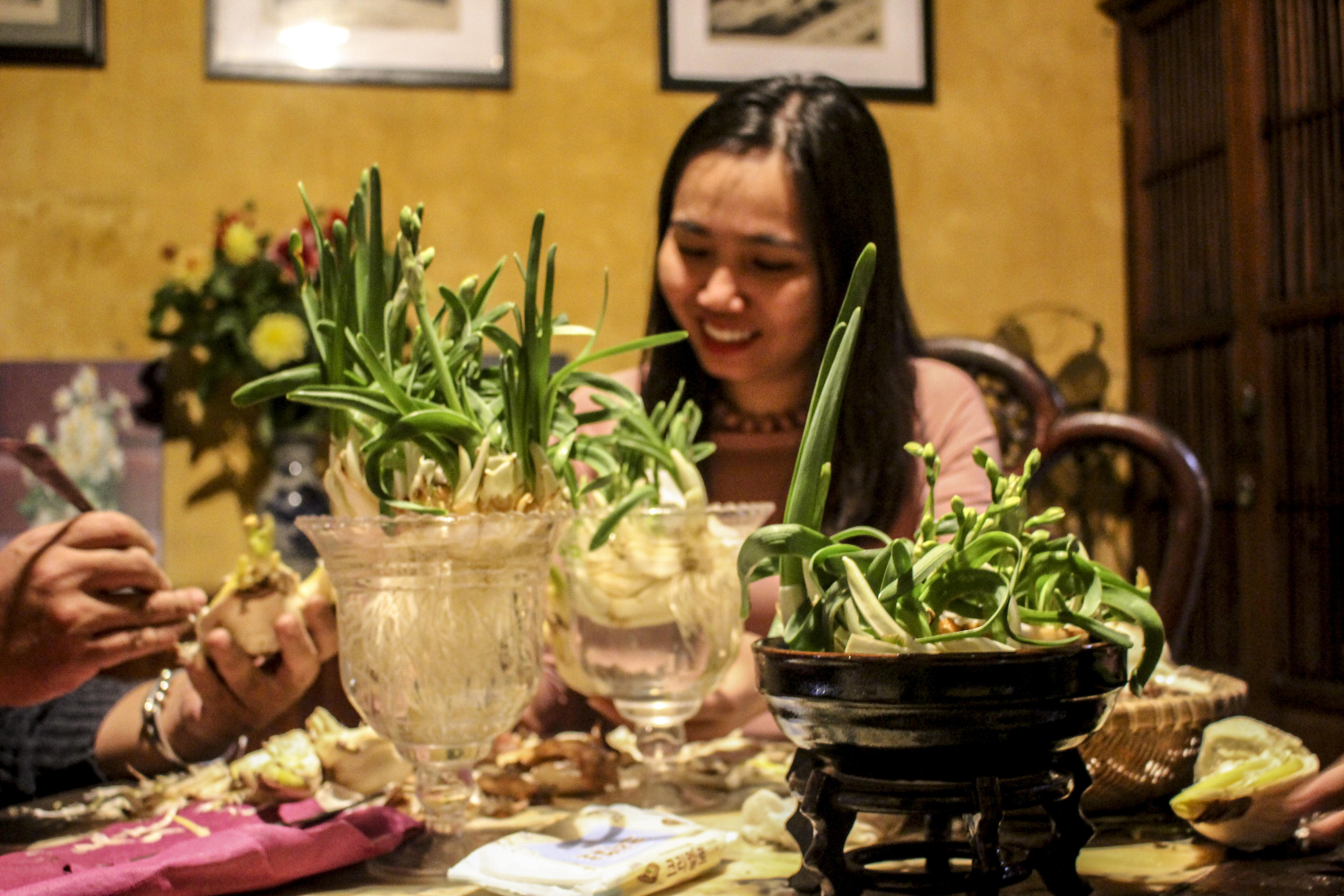 Anh Nghĩa chia sẻ: Để làm một bình hoa thủy tiên đẹp anh phải dùng dao gọt củ mất tầm khoảng 30 phút. Sau khi gọt, củ hoa lộ ra phần mầm xanh, sẽ được dưỡng bằng nước sạch trong chậu đất hoặc thủy tinh. Nước được thay mỗi ngày. Sau một thời gian ẩn mình, thuỷ tiên sẽ bắt đầu phát triển lá và hoa bắt đầu nở.”