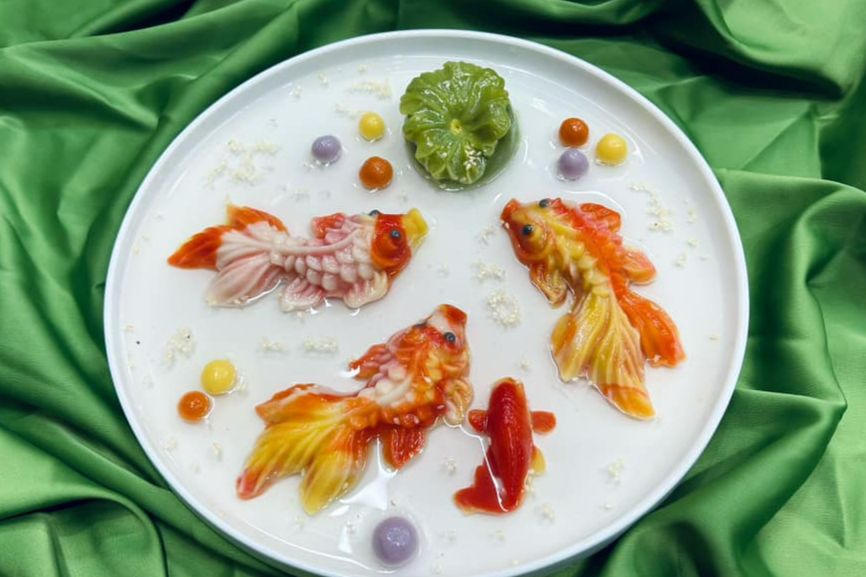 Mâm bánh hình đàn cá vàng 'hút mắt' người xem. (Ảnh: Nhà Còi) |