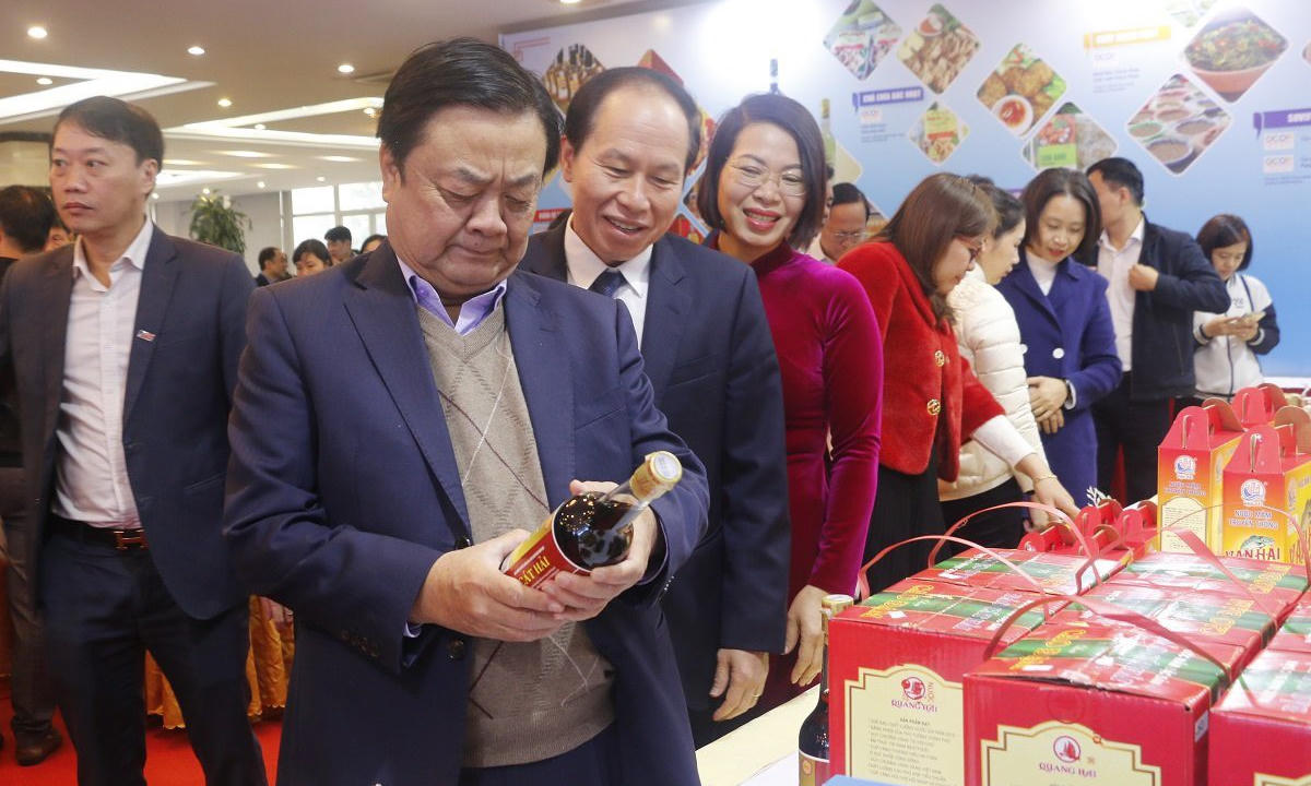 Bộ trưởng Lê Minh Hoan và Bí thư Thành ủy Hải Phòng Lê Tiến Châu cùng các đại biểu tham quan các gian hàng OCOP bên lề Hội nghị. |