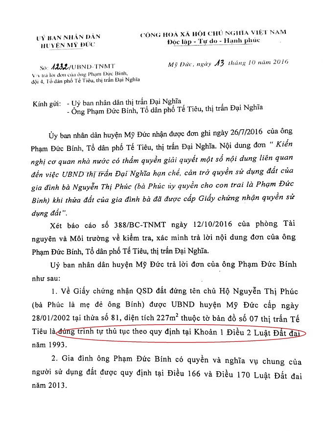 Sau nhiều lần gửi đơn khiếu nại tới UBND huyện Mỹ Đức, ngày 13/10/2016, anh Bính nhận được văn bản trả lời số 1232 của UBND huyện Mỹ Đức do Phó chủ tịch UBND huyện ông Đặng Văn Triều ký.