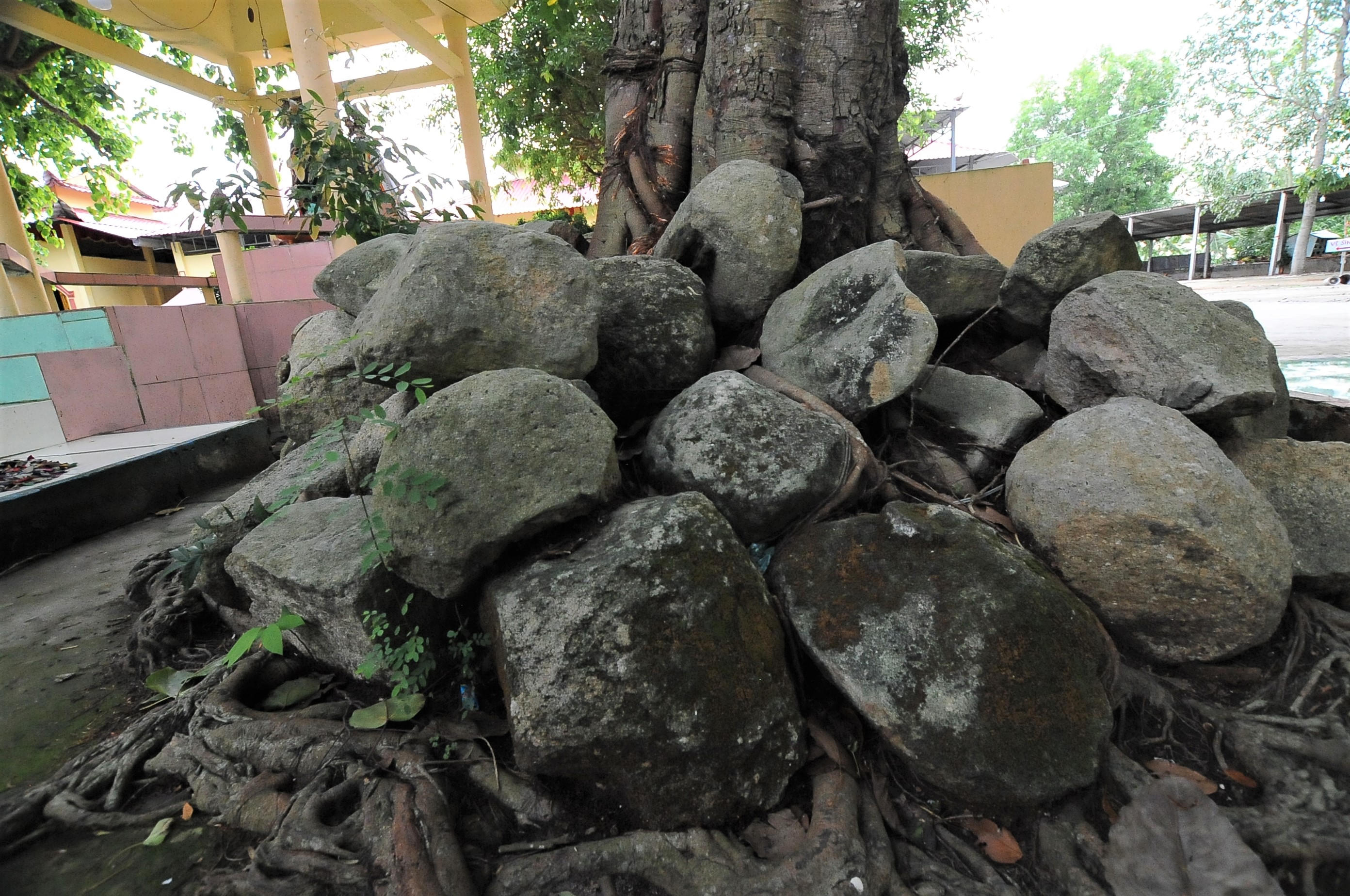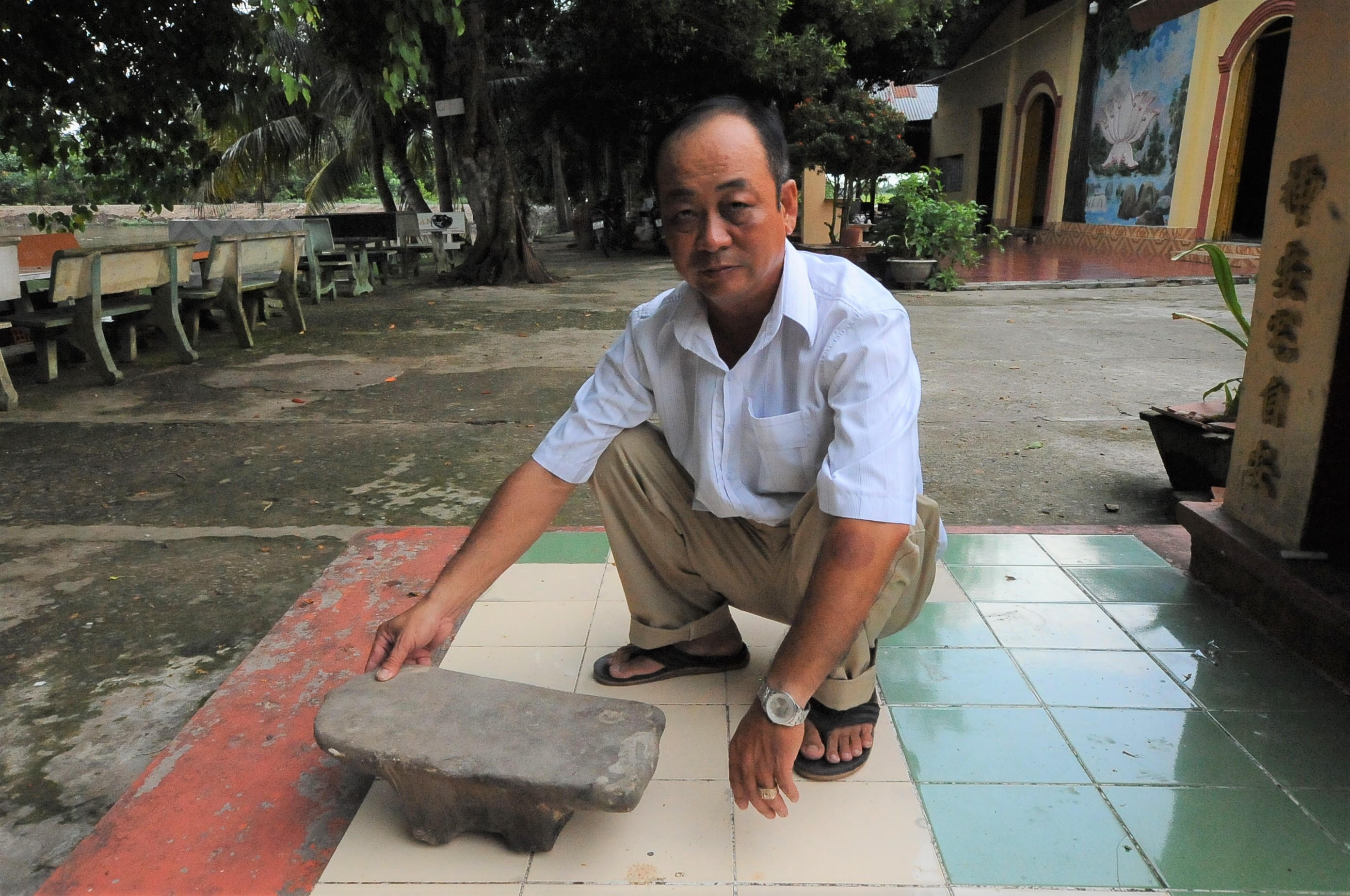 Ông Trạc chỉ tay về phía cánh đồng: “Tuy bà con lấp đất trồng lúa rồi nhưng sâu dưới lớp sình đất vẫn con nhiều đá lắm. Bà con mà có vô tình phát hiện cũng không dám đem đi đâu mà gom lại, xếp gọn gàng quanh những gốc cây trong khuôn viên miếu”.