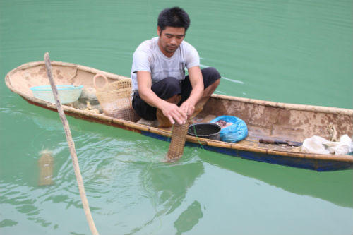 Trời vừa sập tối, ánh nắng chiều vừa khuất dưới những ngọn đồi cũng là lúc anh Nam buông xong tay bẫy câu làm bằng tre cuối cùng. Đưa thuyền vào chân núi gần bờ, ngồi nghỉ ngơi một lát, anh Nam lấy hộp nhựa đựng cơm từ trong chiếc thùng xốp nhỏ mang theo trên thuyền ra để dùng bữa tối ngay trên thuyền. Bữa tối của anh Nam chỉ là cơm nguội mang theo từ chiều và một ít trứng kho. “Từ ngày hành nghề đánh bắt cá trên lòng hồ, hầu như buổi tối nào việc ăn uống, thậm chí ngủ tối cũng trên thuyền. Nên trên thuyền lúc nào mình cũng thủ sẵn chiếc mền để tranh thủ chợp mắt trong khi chờ kéo bẫy”- anh Nam chia sẻ.