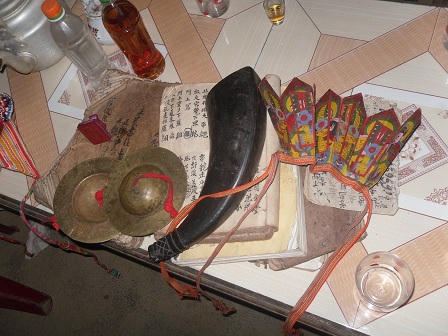 Khi tiến hành lễ cấp sắc “Qua tang” cho con cháu, gia đình và họ hàng phải tìm 3 thầy Tào đến để làm “sứ giả” báo cáo với tổ tiên, cõi âm. Ngoài những trang phục, đạo cụ như sách Nôm Dao, chũm chọe, thanh la, kèn… thì vật không thể thiếu của thầy Tào đó là 3 bộ Tam thanh gồm một bộ lớn, 2 bộ nhỏ, trong đó thầy Tào trưởng mang theo một bộ lớn, hai thầy Tào phụ đem 2 bộ nhỏ vẽ hình ảnh của các vị thánh. Lễ cấp sắc “Qua tang” diễn ra 2 ngày một đêm, gia đình sẽ tốn khoảng 15 triệu bao gồm tất cả các đồ lễ, vật nuôi, thuê thầy Tào…