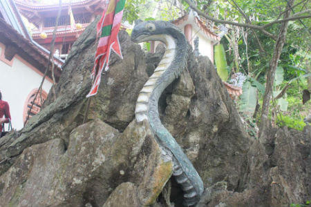 Thấy tôi loay hoay chụp ảnh con rắn bằng bê tông ấy, chị Minh - người bán nhang rong - đến bảo: “Ngài thiêng lắm, ai đến cũng phải khói hương đàng hoàng chứ không dám chụp ảnh nghênh ngang như chú đâu. Chị bán nhang ở đây, được chứng kiến nhiều chuyện của “ngài” thiêng lắm đấy…”. Tôi đồ rằng, chị Minh cứ tuôn một tràng như thế có lẽ cốt là để bán nhang lễ cho khách hành hương. Nhưng lạ là, chuyện về “ngài” rắn lại có nhiều người khác cũng kể y như vậy.