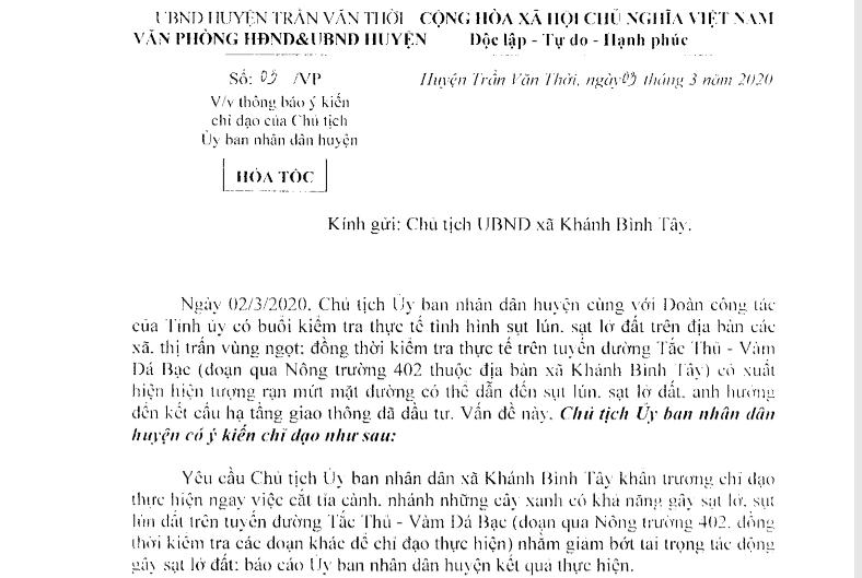 Ngay sau đó, Văn phòng HĐND và UBND huyện Trần Văn Thời đã kịp thời ban hành công văn hỏa tốc số 03/VP ngày 03/03/2020, thông báo ý kiến chỉ đạo của Chủ tịch UBND huyện trong việc xử lý tình trạng rạn nứt mặt đường trên tuyến Tắc Thủ- Vàm Đá Bạc (huyện Trần Văn Thời, tỉnh Cà Mau)