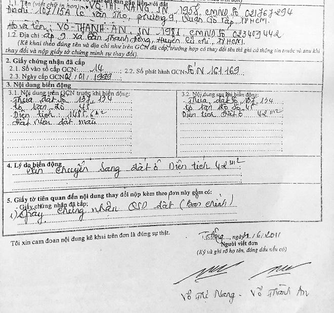 Theo đó, trong hồ sơ đăng ký cấp sổ đỏ đồng sở hữu, có một đơn đề nghị đăng ký biến động về quyền sử dụng đất với phần đất 1.485 m2. Ở phần ký tên của anh An, ai đó đã ký tên thay anh bên cạnh chữ ký bà Nang.