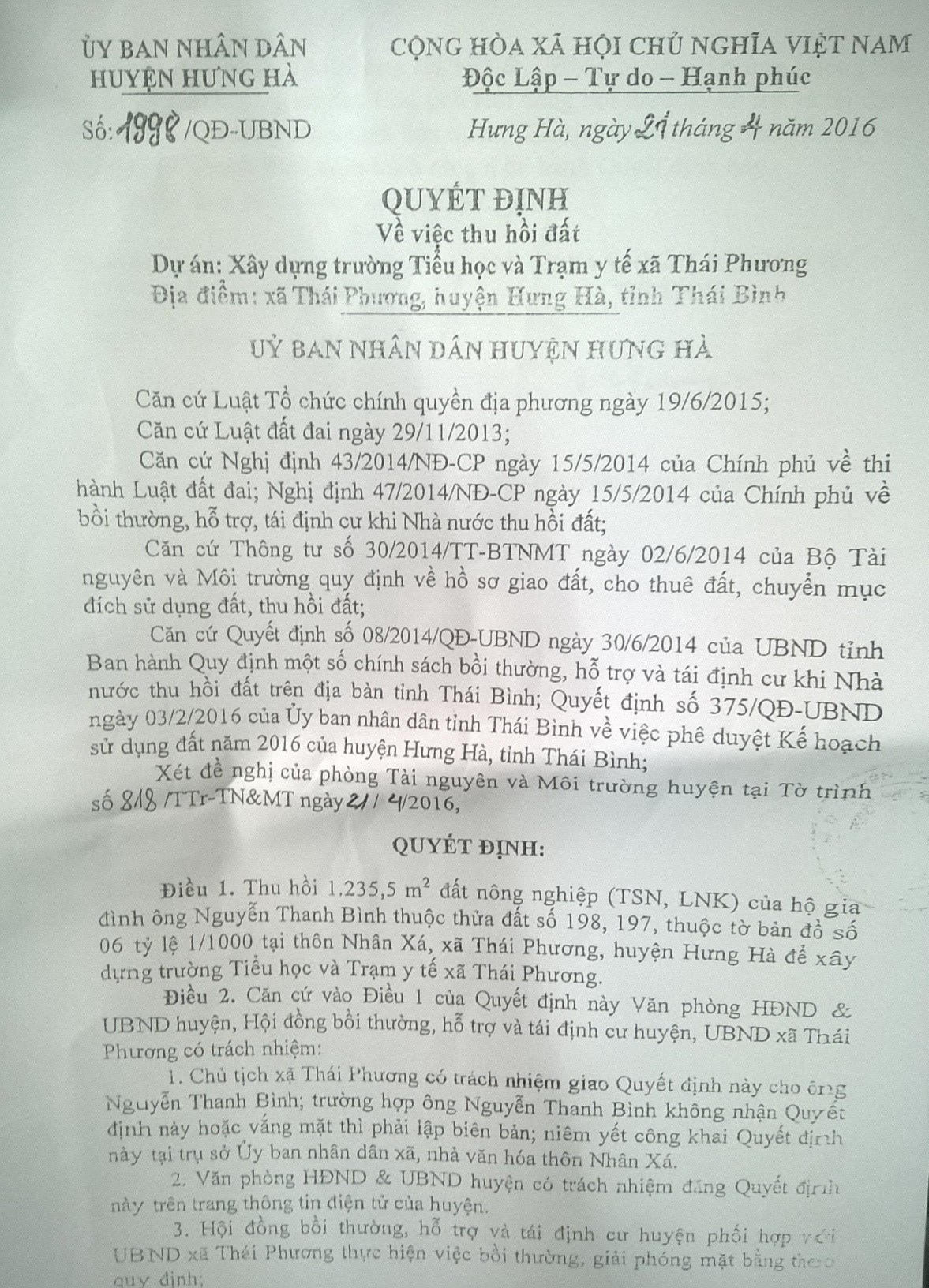 Thưa ông Thế Anh, thủ tục lập phương án thu hồi đất của UBND huyện Hưng Hà đối với 3 hộ dân ở xã Thái Phương nói trên có đúng không?