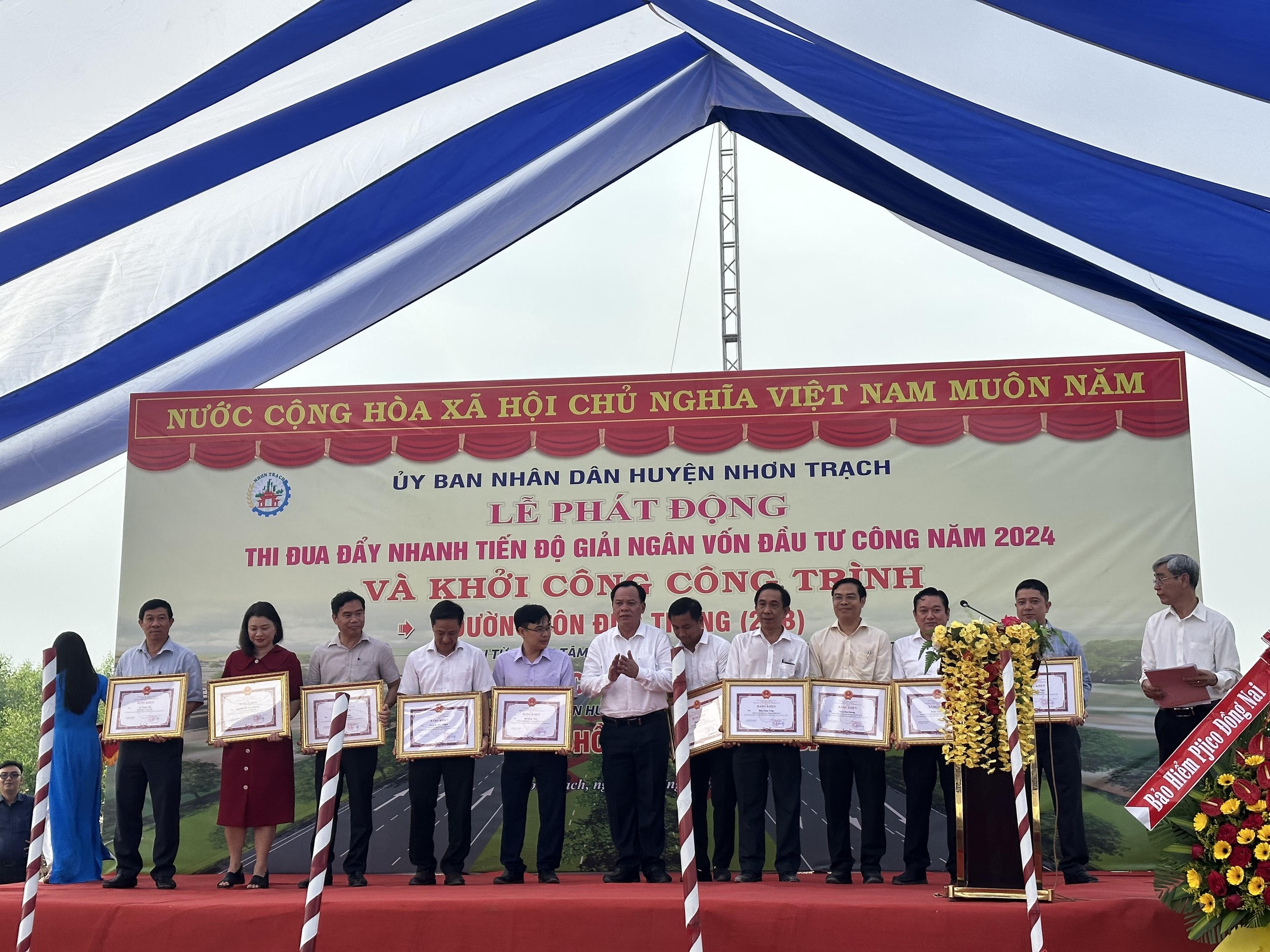 Ông Võ Tấn Đức, Quyền Chủ tịch UBND tỉnh đã trao tặng bằng khen của tỉnh cho các cá nhân, tập thể có thành tích xuất sắc trong việc giải ngân vốn đầu tư công của huyện Nhơn Trạch.