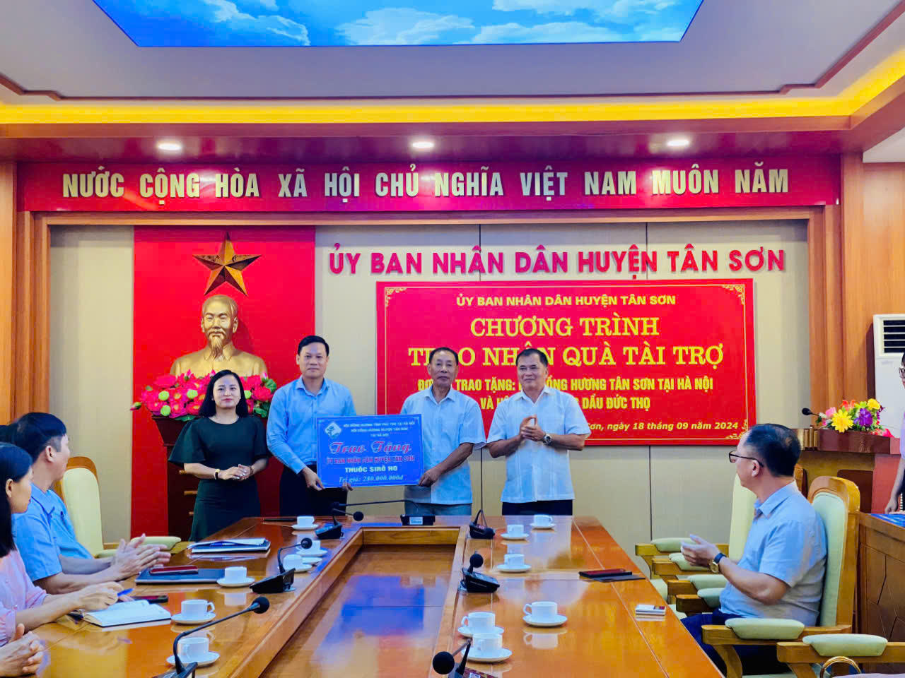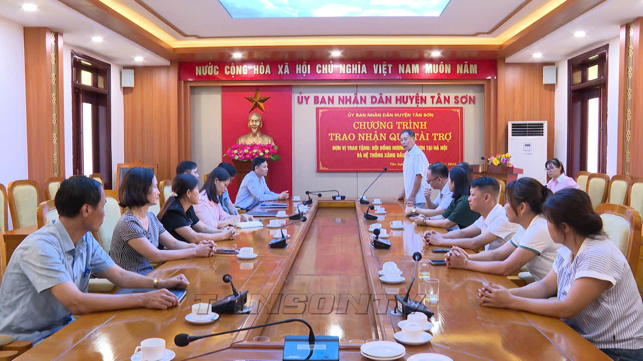 Đại diện nhà tài trợ tại chương trình trao nhận quà có ông Hoàng Xuân Cừ - nguyên Ủy viên BCH Trung ương Đảng, nguyên Bí thư Đảng đoàn khối Cơ quan Trung ương, nguyên Bí thư Tỉnh ủy Phú Thọ, Chủ tịch Hội đồng hương (HĐH) tỉnh Phú Thọ tại Hà Nội, ông Hà Ninh - Chủ tịch HĐH Tân Sơn tại Hà Nội, ông Lê Toàn Thắng - Phó Chủ tịch HĐH Tân Sơn tại Hà Nội Chủ tịch HĐQT Hệ thống xăng dầu Đức Thọ và bà Nguyễn Thị Thanh Tuyền - Phó Chủ tịch HĐH Tân Sơn tại Hà Nội.
