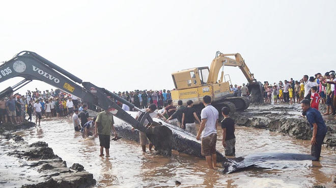 Cùng ngày, xác cá voi cũng được lực lượng cứu hộ, Bộ đội biên phòng và người dân kéo vào bờ, chờ thủy triều lớn để đưa cá lên cạn tiến hành làm lễ mai táng.