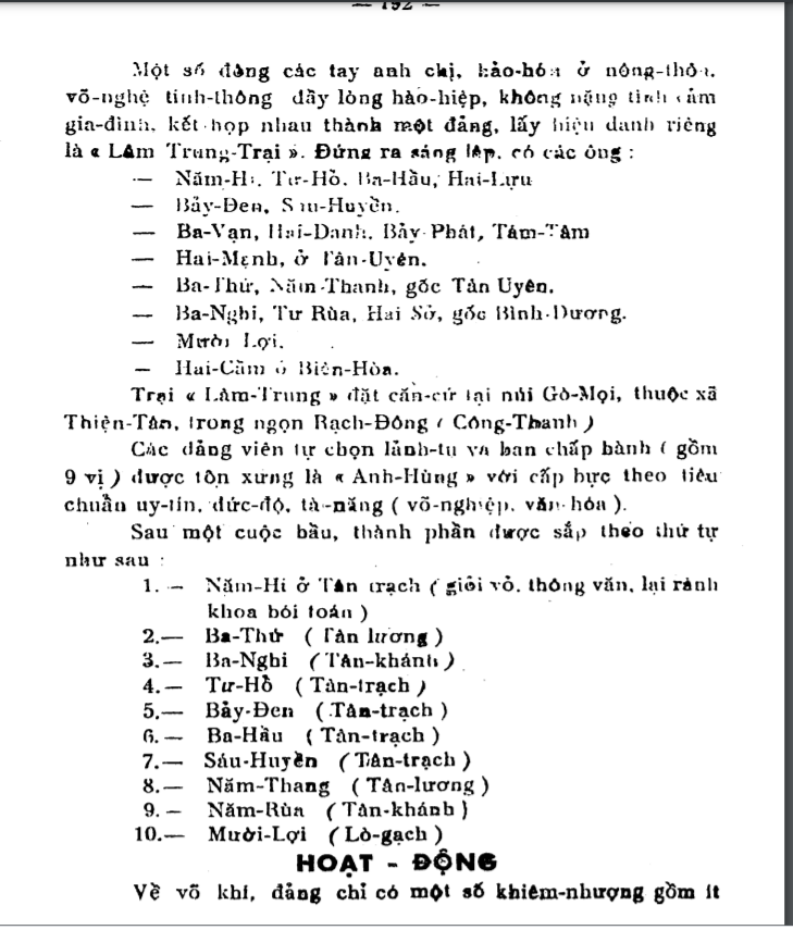 Phạm vi hoạt động của tổ chức này càng ngày càng được mở rộng. Hội viên của trại Lâm Trung ngày một đa dạng, trong đó phân nửa lực lượng là nông dân ở đồng quê. Trong đó trai tráng là lực lượng hoạt động chính, đảm nhận nhiệm vụ cốt yếu, còn người có gia đình, người lớn tuổi thì thực hiện nhiệm vụ cảm tình viên. Những gia đình giàu có thì làm ủng hộ viên. Trại dần dần cũng trang bị được một số súng, thậm chí có những loại súng hiện đại từ tay thực dân Pháp.