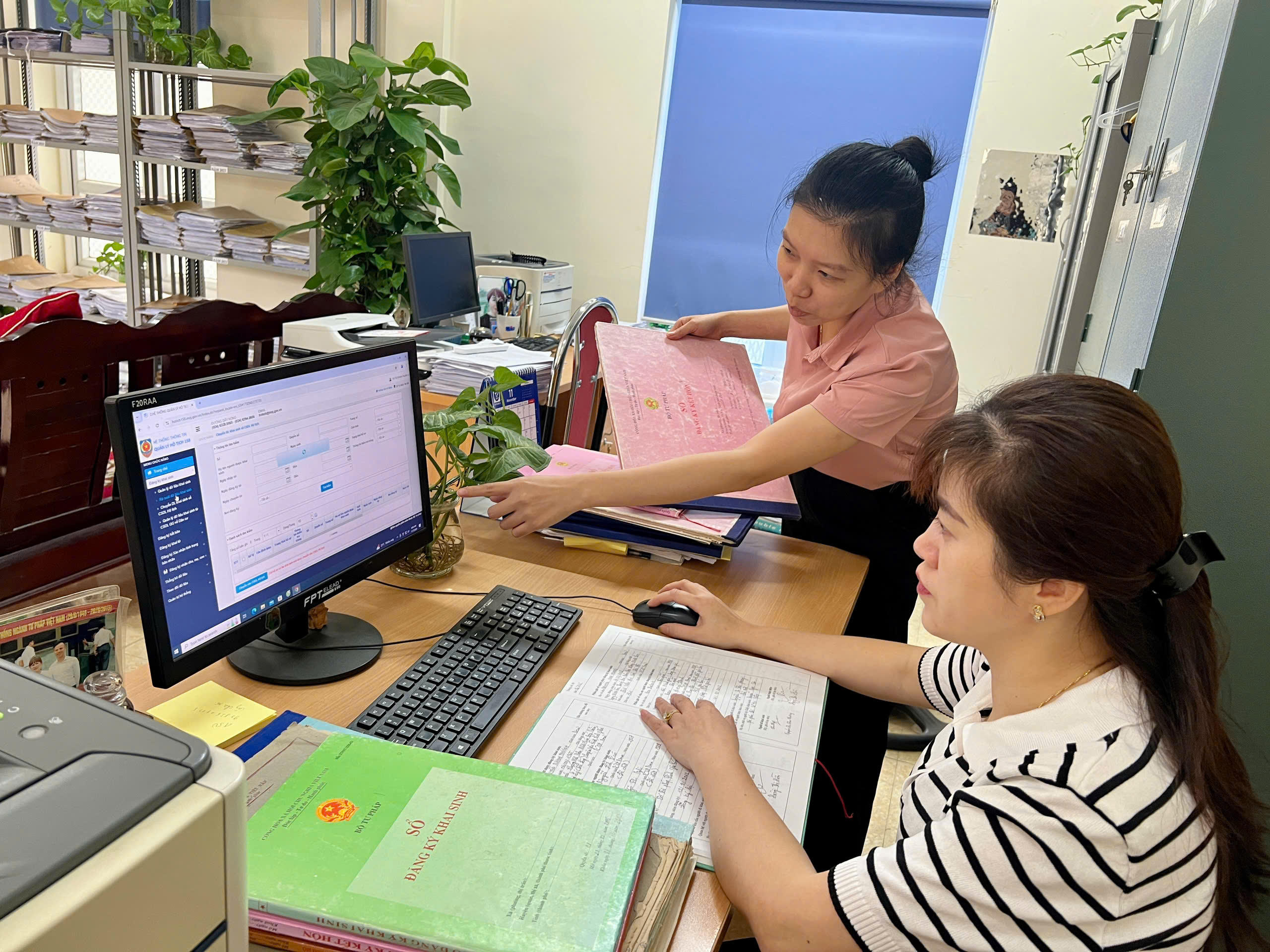 Công chức Tư pháp Yên Bái nhập thông tin từ sổ hộ tịch giấy lên sổ hộ tịch điện tử của Bộ Tư pháp. Ảnh: CTV. |