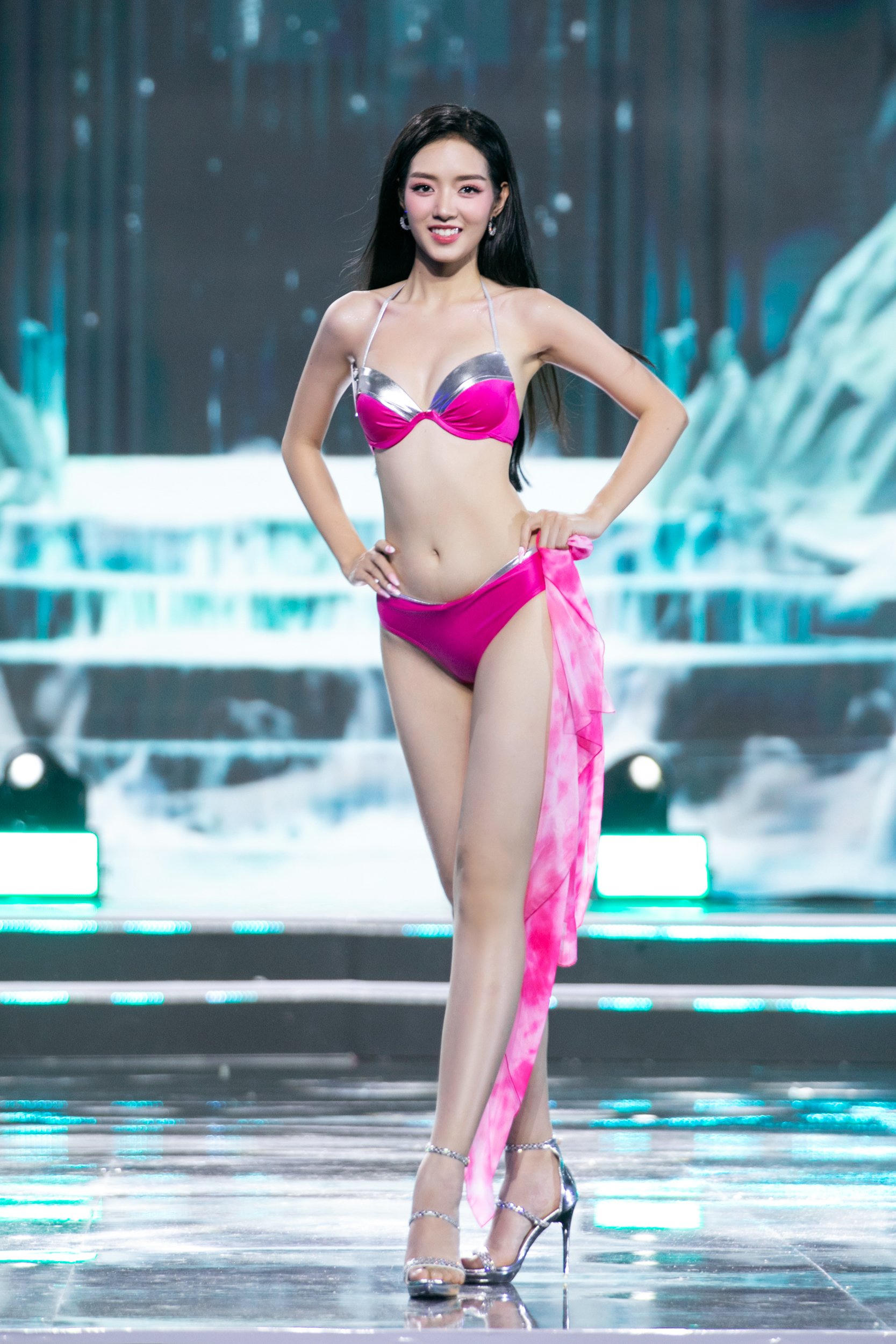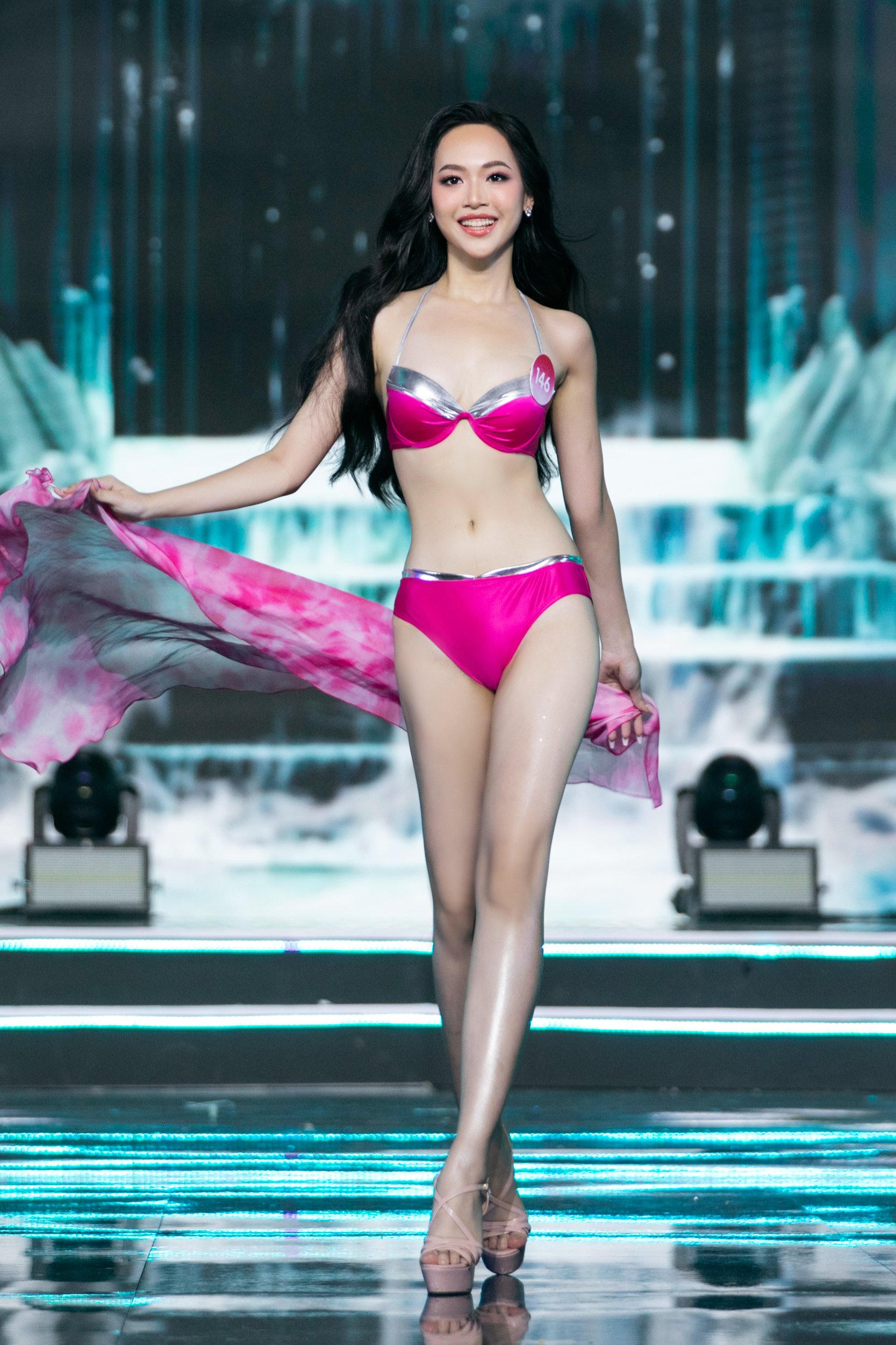 Trong khi đó, trên nền ca khúc “Vắng anh đời vẫn đẹp” (do Kiều Loan thể hiện), 35 thí sinh xuất hiện trên sân khấu và đồng diễn áo tắm. Các cô gái biểu diễn catwalk kết hợp những động tác vũ đạo đơn giản. Sau phần này, MC công bố top 20.