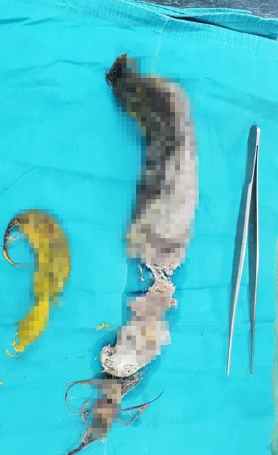 Ngay lập tức, các bác sĩ tiến hành phẫu thuật gắp 2 khối bã thức ăn có kích thước 10x4 cm trong dạ dày và trong ruột non có kích thước 5x4 cm.