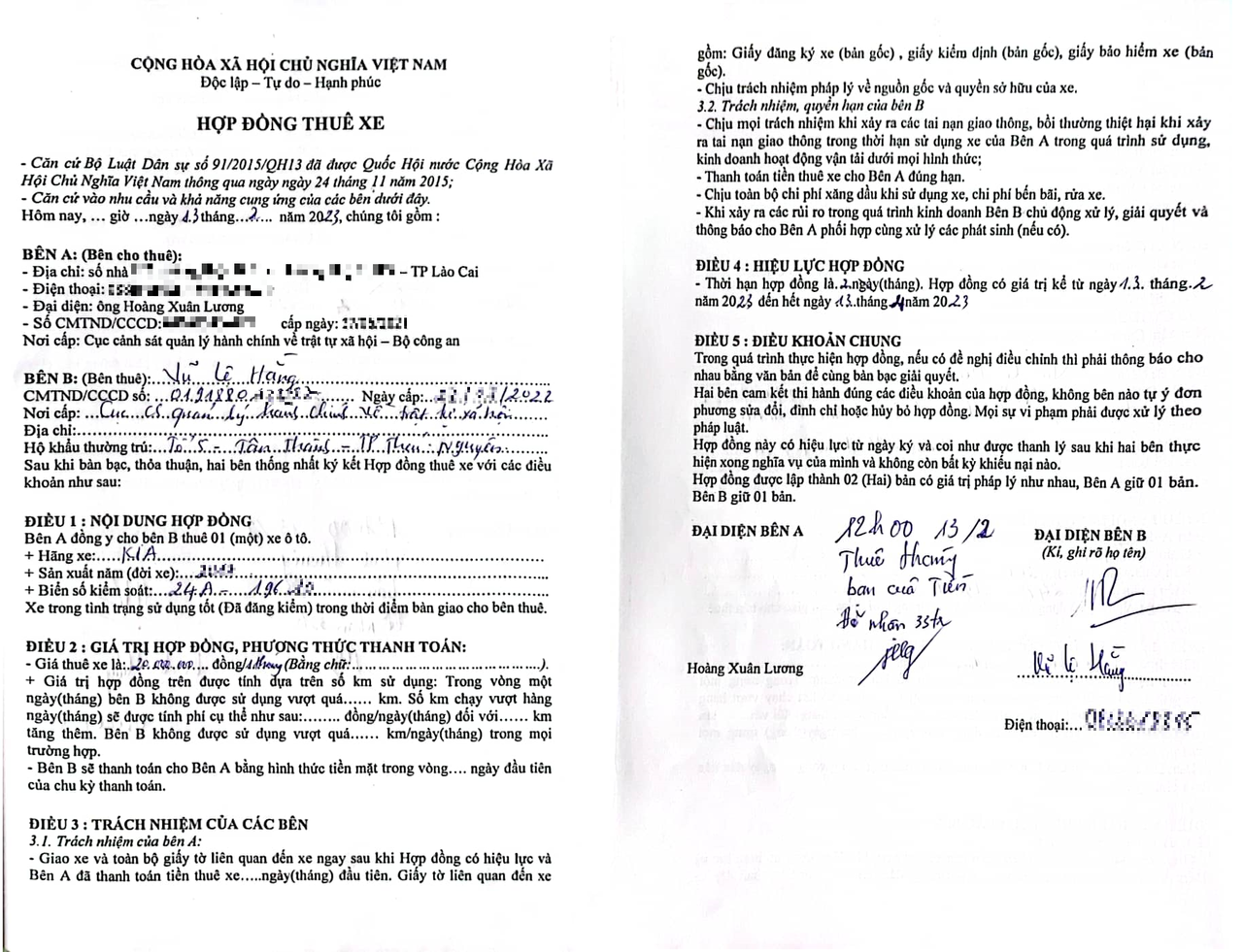 - Theo đơn gửi về tòa soạn, ông Hoàng Xuân Lương cho biết, ngày 13/2/2023 đã cho bà Vũ Lệ Hằng thuê chiếc xe chính chủ nhãn hiệu KIA, màu trắng mang biển kiểm soát 24A-196.** với thỏa thuận giá thuê theo tháng là 20 triệu đồng.