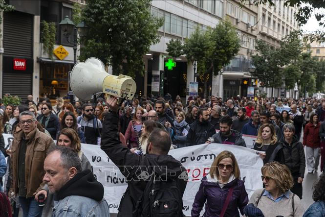 Người dân tuần hành bày tỏ sự phẫn nộ về vụ tai nạn đường sắt tại Athens, Hy Lạp ngày 16/3/2023. Ảnh: THX/TTXVN