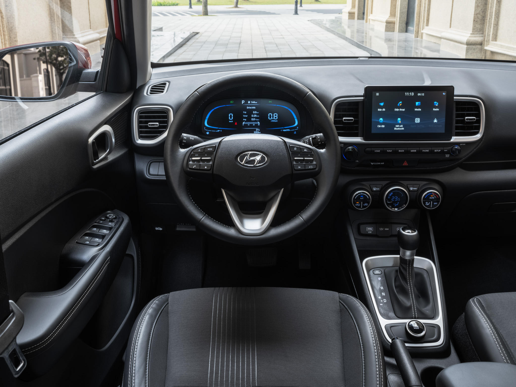 Bảng taplo xe nổi bật với màn hình đa thông tin và màn hình giải trí cảm ứng 8 inch điều khiển đa chức năng nằm ở vị trí trung tâm, tích hợp camera lùi. Màn hình của xe hỗ trợ đầy đủ kết nối Android Auto, Apple Carplay, Bluetooth cũng như bản đồ dẫn đường được Hyundai Thành Công phát triển riêng dành cho thị trường Việt Nam. Đặc biệt Venue cũng trang bị cổng sạc dạng USB Type-C tiện dụng nhất hiện nay với khả năng sạc nhanh trên cả hàng ghế phía trước và phía sau. Người dùng có thể hài lòng với hệ thống âm thanh 6 loa theo xe đạt chất lượng tốt.