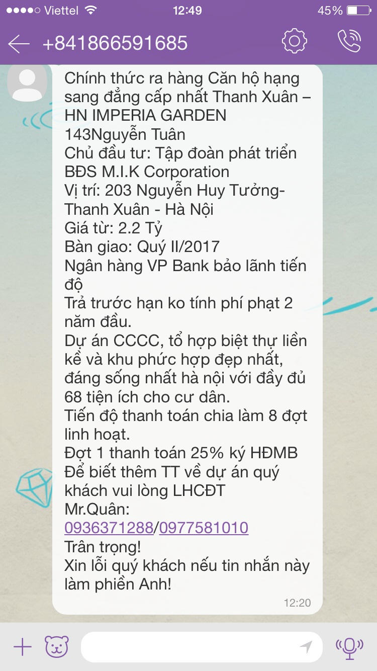 Khoảng 2 tháng trở lại đây, chị Trần Thảo ở Ba Đình, Hà Nội liên tiếp nhận được nhắn tin, điện thoại chào mời mua căn hộ hạng sang tại dự án Imperia Garden 203 Nguyễn Huy Tưởng. Thấy quảng bá hấp dẫn, dự án ở vị trí trung tâm quận Thanh Xuân, gần nhà ông bà nội nên chị Thảo quan tâm tìm hiểu và ngỏ ý muốn mua một căn diện tích nhỏ, chừng 66m2, ban công đông nam.