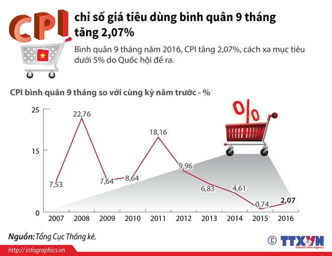 (PLO) - Theo Tổng cục Thống kê, bình quân 9 tháng năm 2016, CPI tăng 2,07%, cách xa mục tiêu dưới 5% do Quốc hội đề ra./.