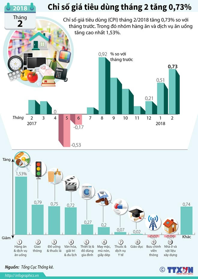 Chỉ số giá tiêu dùng (CPI) tháng 2/2018 tăng 0,73% so với tháng trước, trong đó nhóm hàng ăn và dịch vụ ăn uống tăng cao nhất 1,53%./.