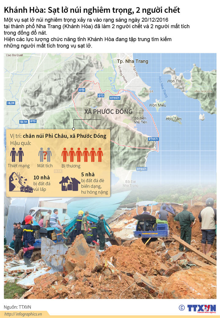 (PLO) - Một vụ sạt lở núi nghiêm trọng xảy ra vào rạng sáng ngày 20/12/2016 tại thành phố Nha Trang (Khánh Hòa) đã làm 2 người chết và 2 người mất tích trong đống đổ nát. Hiện các lực lượng chức năng tỉnh Khánh Hòa đang tập trung tìm kiếm những người mất tích trong vụ sạt lở.